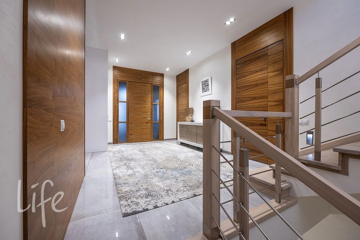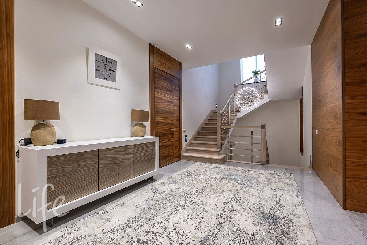 Загородный дом площадью 520 квадратных метров, расположенный на Новорижском шоссе, всего в 23 километрах от МКАД, в элитном коттеджном посёлке Новорижский, предлагает современный классический стиль и всё, что необходимо для комфортного проживания.