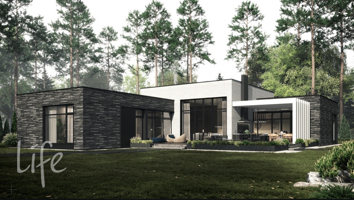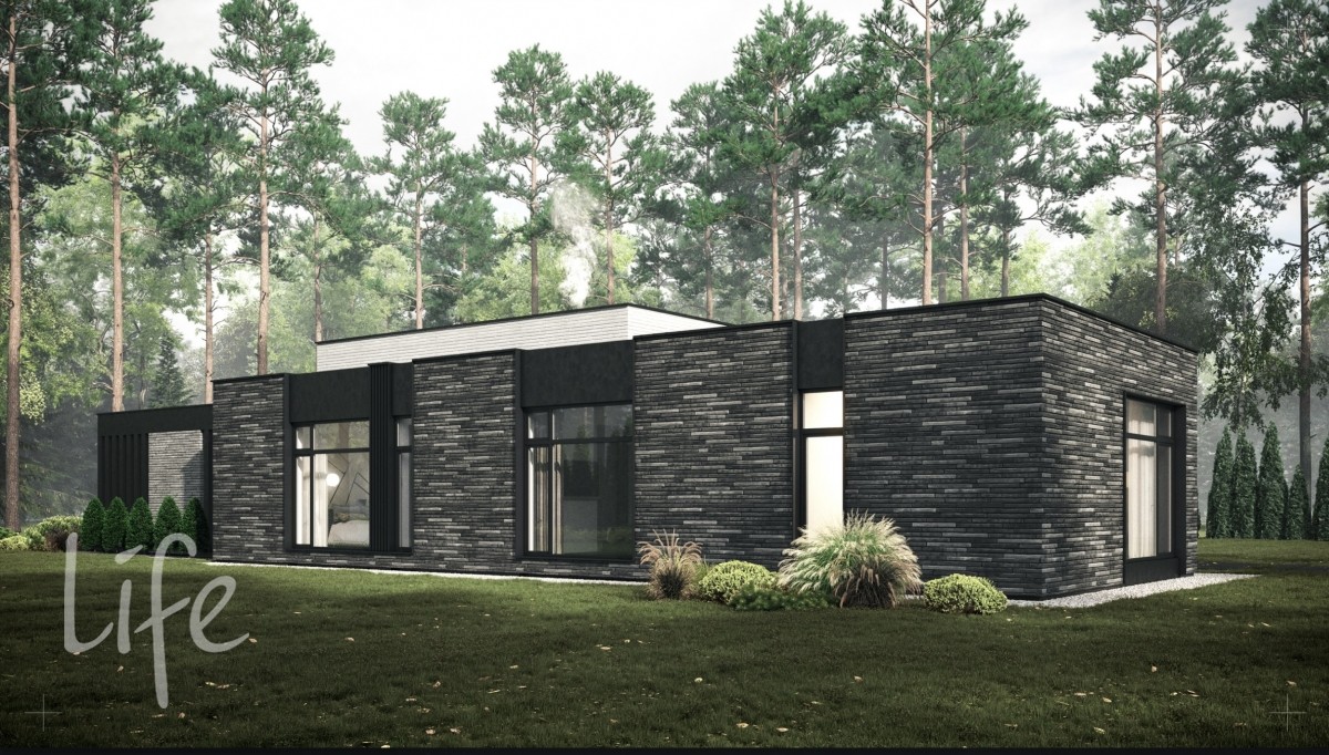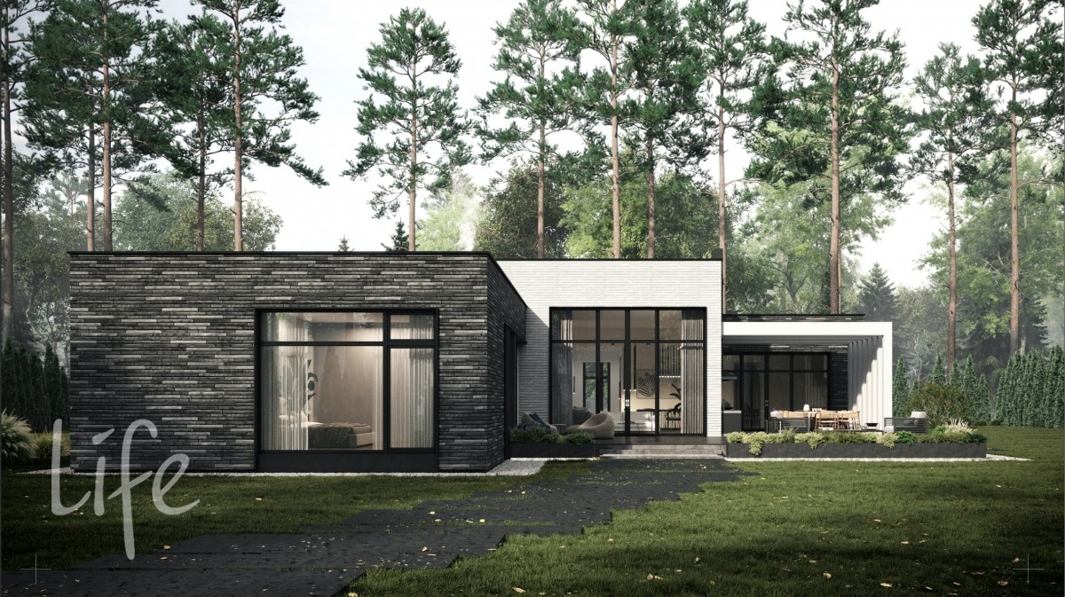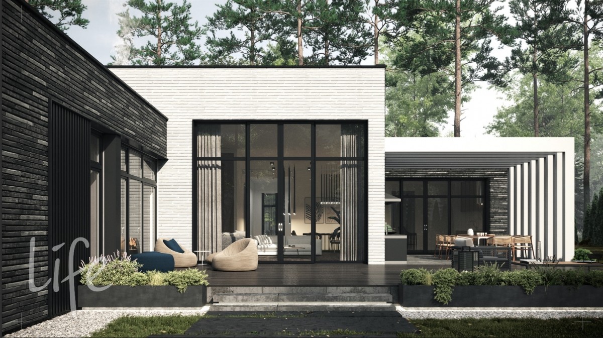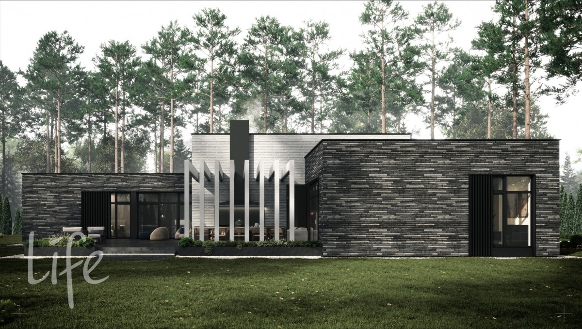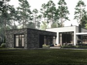 Дом представляет собой компактное одноэтажное разно-высокое здание в модном современном стиле с плоской кровлей и панорамным остеклением. Общая площадь застройки - 458 кв. м.