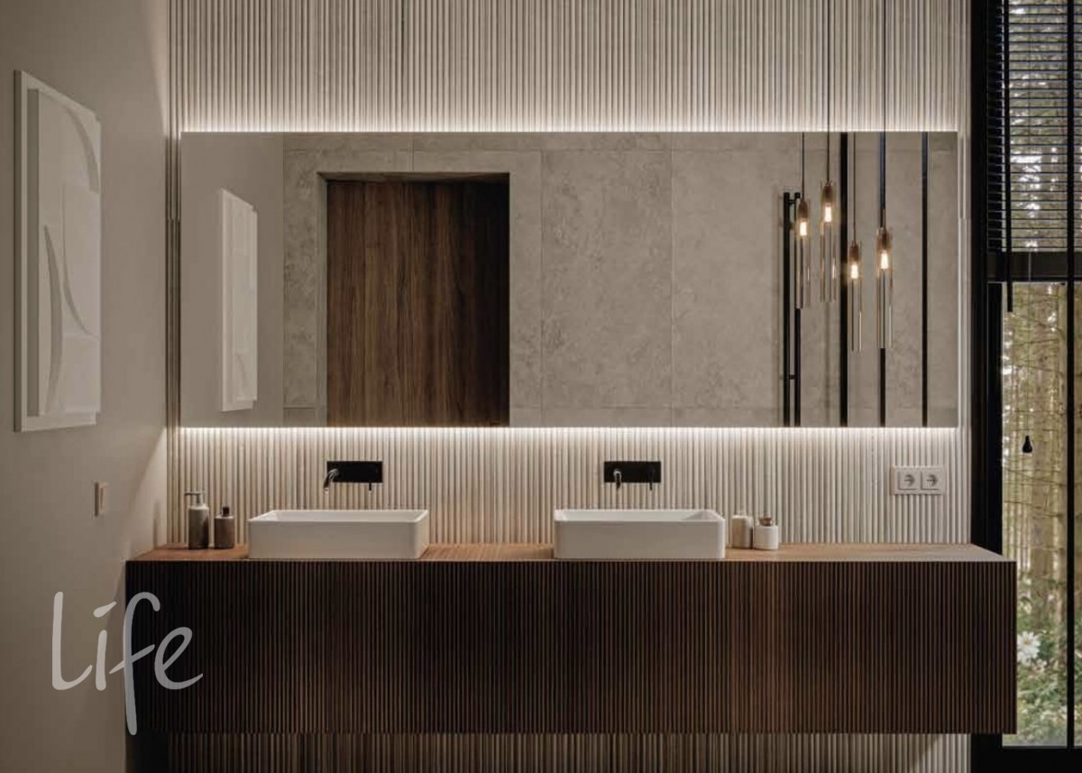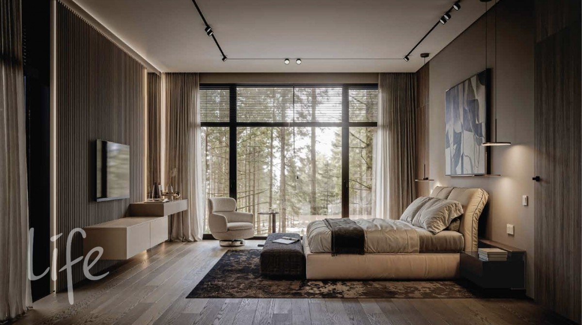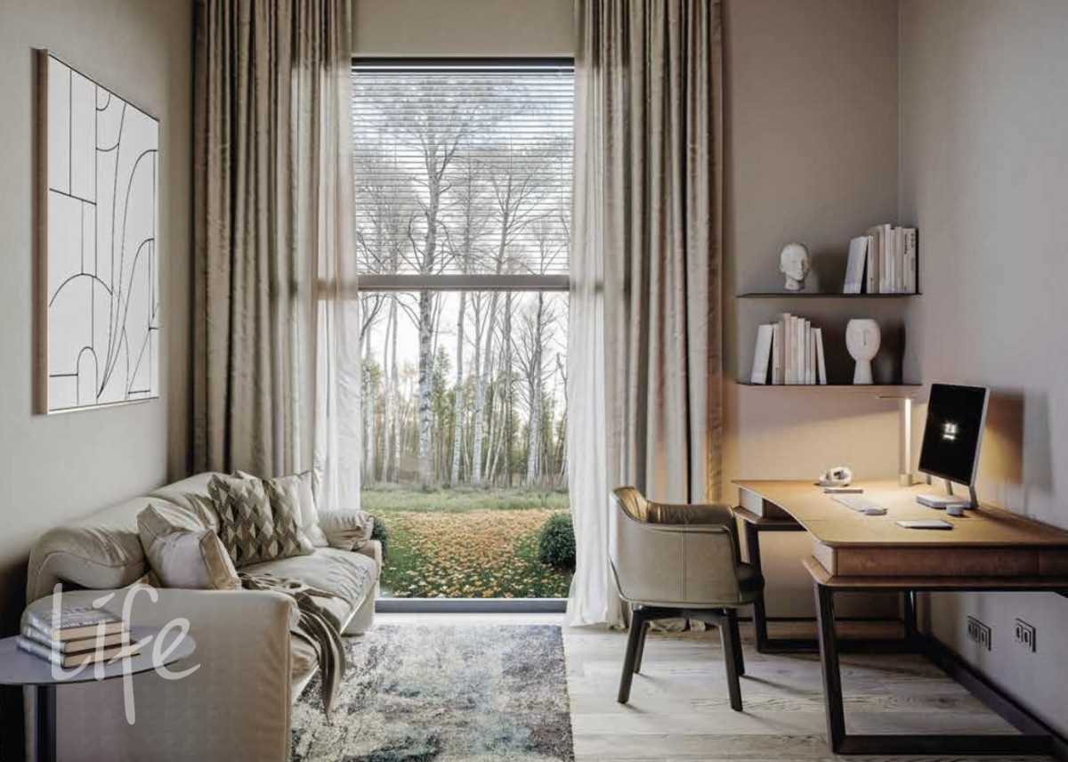 Основное жилое пространство дома включает в себя кухню с островом, столовую и гостиную с каминной зоной, все эти зоны объединены между собой и обращены вглубь участка. Высота потолков в этой части дома 4,5 метра, оконные проемы начинаются прямо от пола, что обеспечивает большую освещенность в дневное время и визуально расширяет пространство.