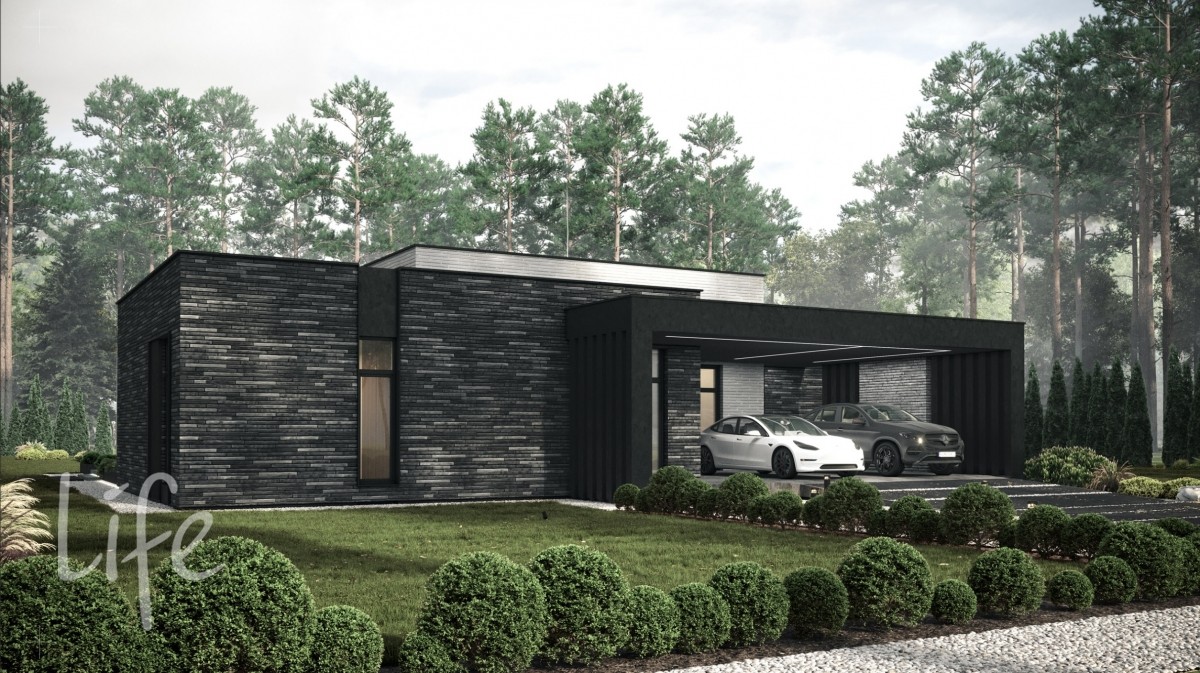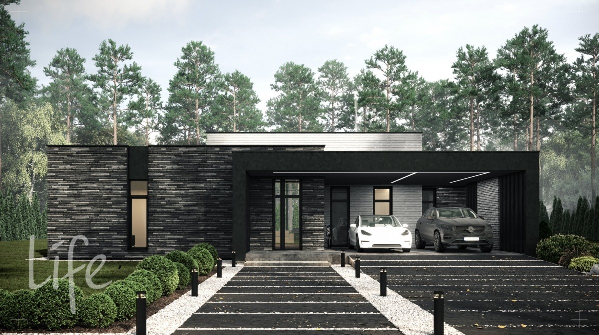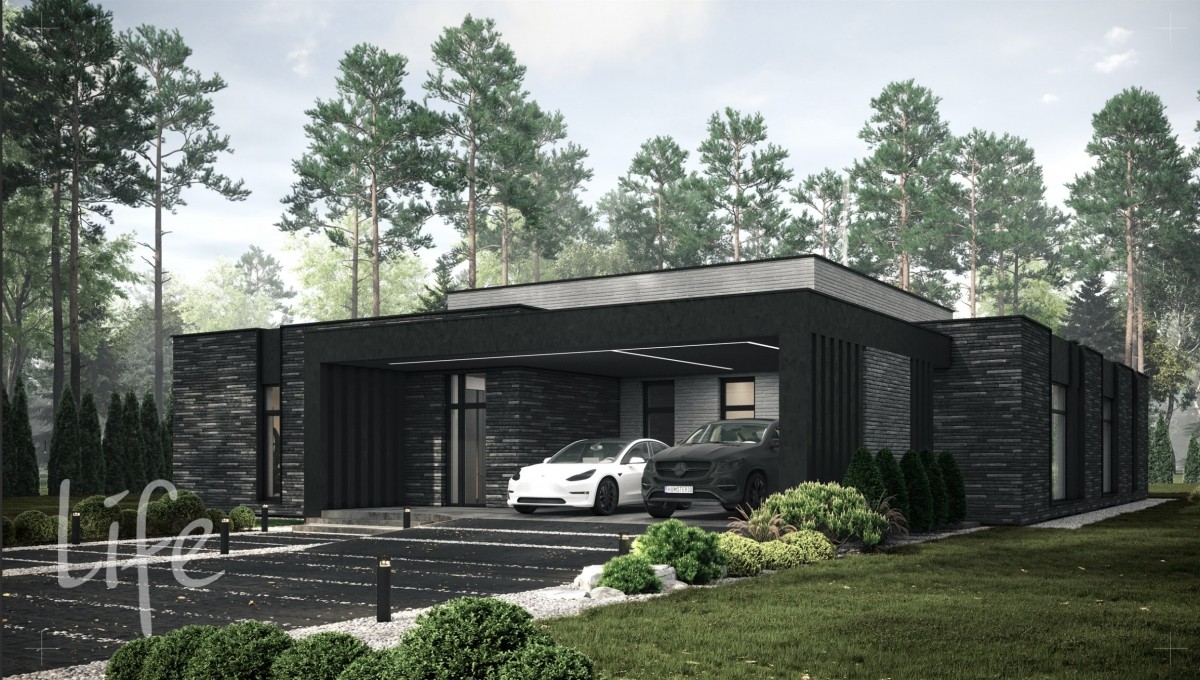 В сторону улицы обращены вход в дом и парковка на два автомобиля, объединенные единым массивным навесом-козырьком.
