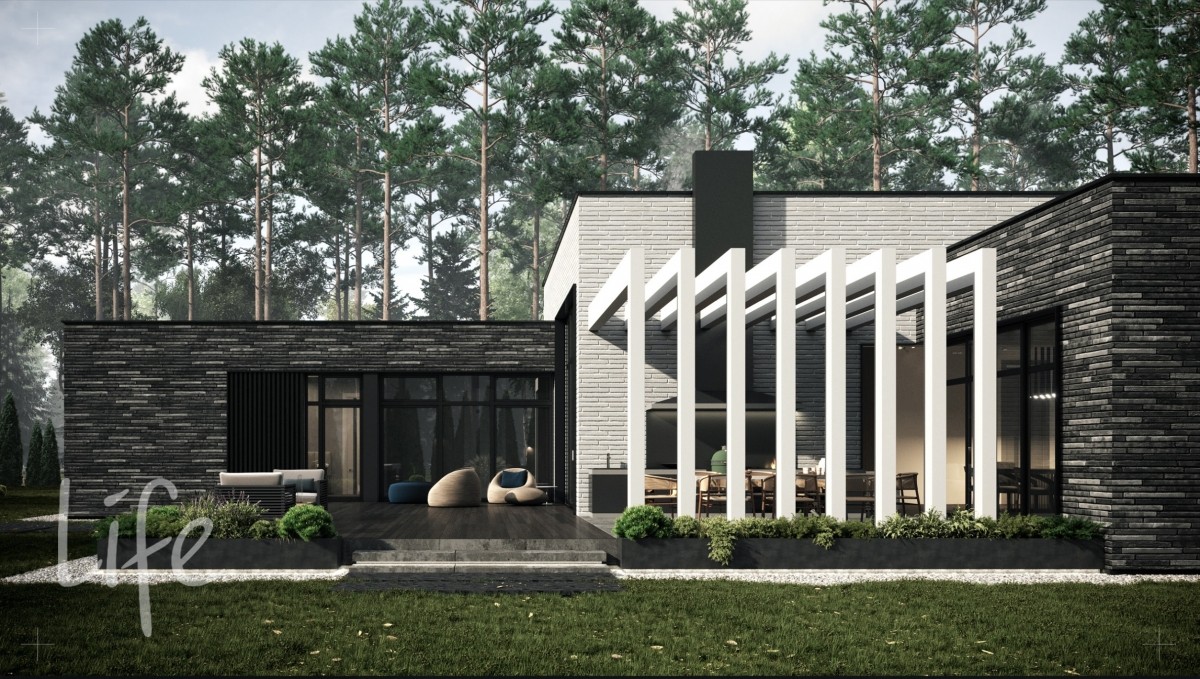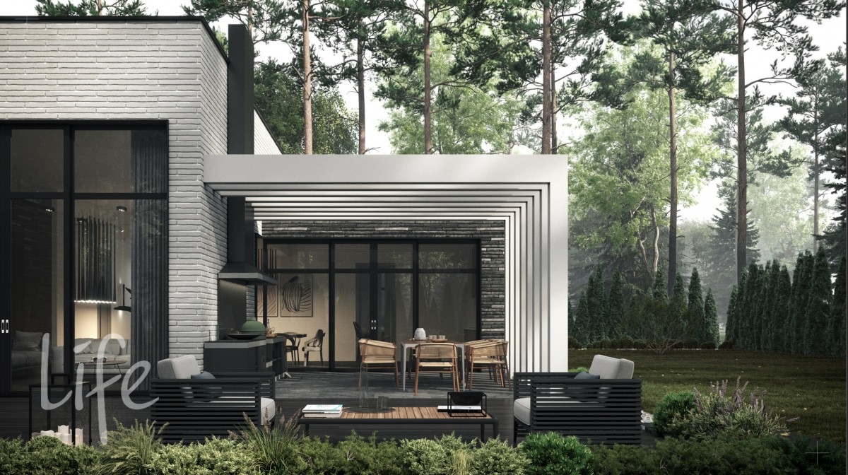 Продолжением дома является опоясывающая просторная открытая терраса с зоной барбекю, перекрытой декоративной перголой.