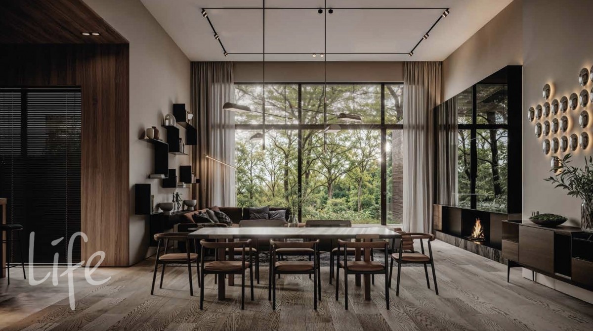 Основное жилое пространство дома включает в себя кухню с островом, столовую и гостиную с каминной зоной, все эти зоны объединены между собой и обращены вглубь участка. Высота потолков в этой части дома 4,5 метра, оконные проемы начинаются прямо от пола, что обеспечивает большую освещенность в дневное время и визуально расширяет пространство.