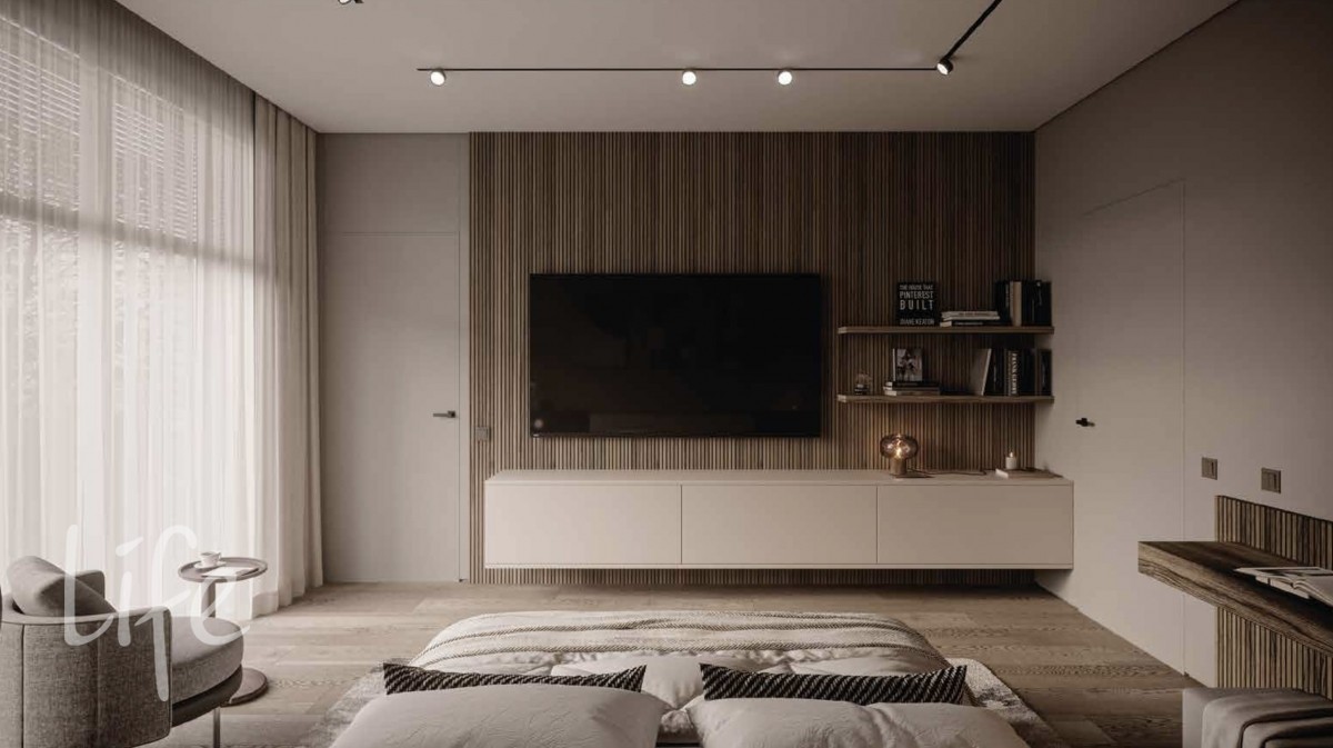 Прихожая (7,8 кв.м.), гардеробная (6,6 кв.м.), гостевой санузел (3,2 кв.м.), гостиная-кухня-столовая (76,5 кв.м.), холл (24,2 кв.м.), кабинет (13,4 кв.м.), мастер-спальня (26,4 кв.м.), мастер-ванная (8,0 кв.м.), мастер-гардеробная (5,7 кв.м.), спальня-2 (18,7 кв.м.), гардеробная-2 (3,2 кв.м.), спальня-3 (18,3 кв.м.), гардеробная-3 (3,2 кв.м.), ванная (6,2 кв.м.), постирочная (9,8 кв.м.), кладовая (3,2 кв.м.), котельная (5,4 кв.м.), терраса (81,6 кв.м.), авто навес (57,8 кв.м.).