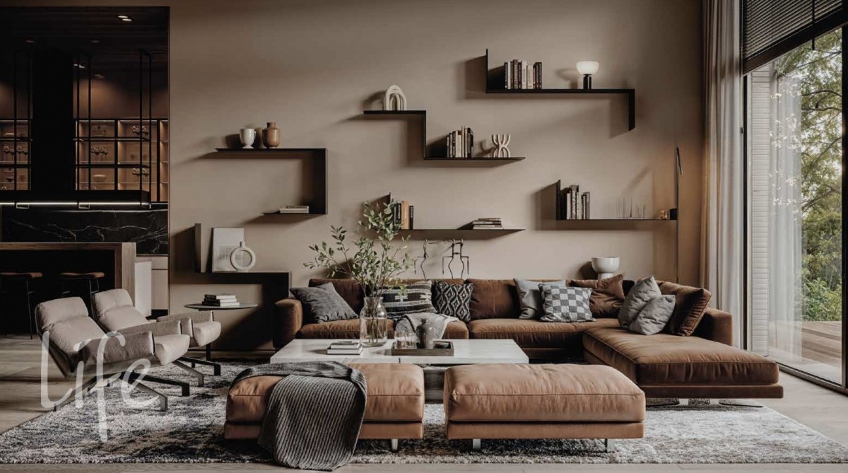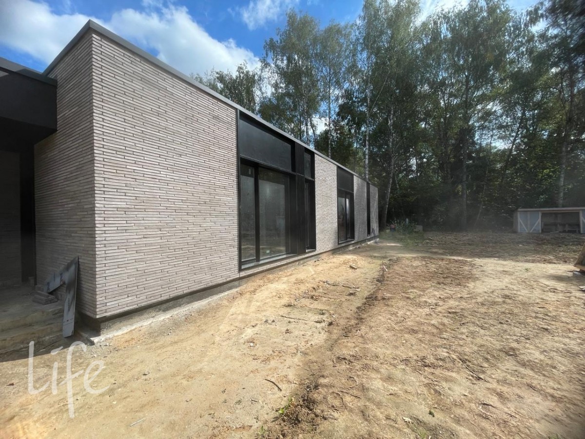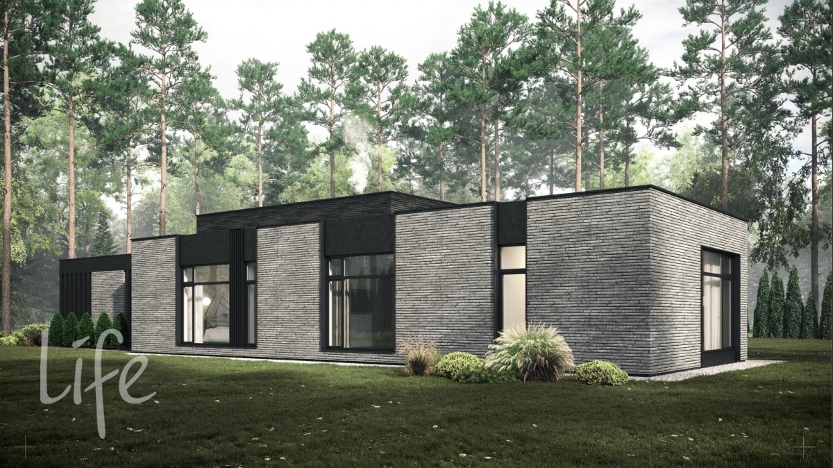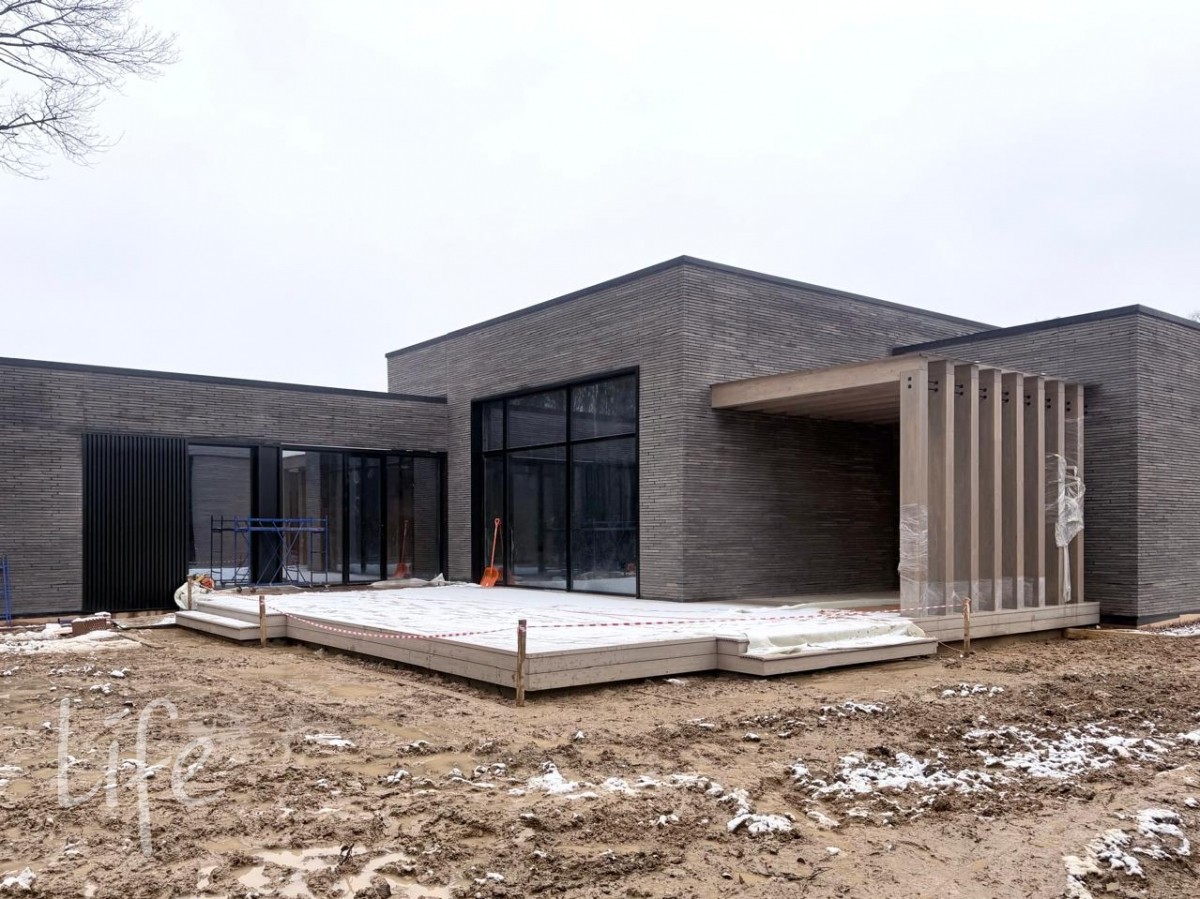 Дом представляет собой компактное одноэтажное разно-высокое здание в модном современном стиле с плоской кровлей и панорамным остеклением. Общая площадь застройки - 458 кв. м.