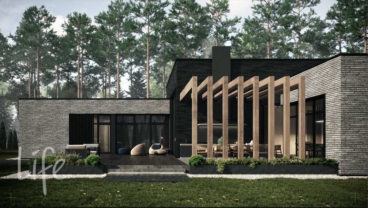 Продолжением дома является опоясывающая просторная открытая терраса с зоной барбекю, перекрытой декоративной перголой.