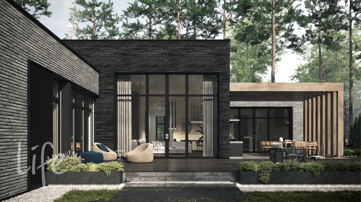 Выверенные пропорции дома и лаконичное сочетание современных отделочных материалов создают привлекательный образ загородной архитектуры, органично и деликатно вписанной в природный ландшафт.