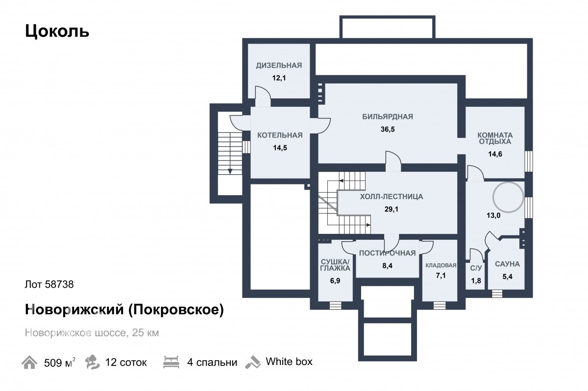 Цоколь: холл, бильярдная, сауна, комната отдыха, постирочная, кладовые, котельная.