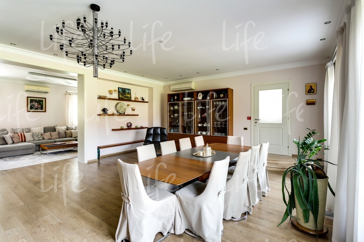1 этаж: столовая-гостиная с камином, кухня, спальня, санузел, кабинет, две гардеробные комнаты, просторная терраса.