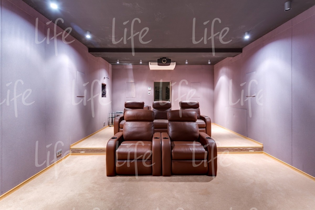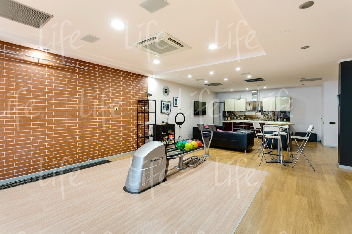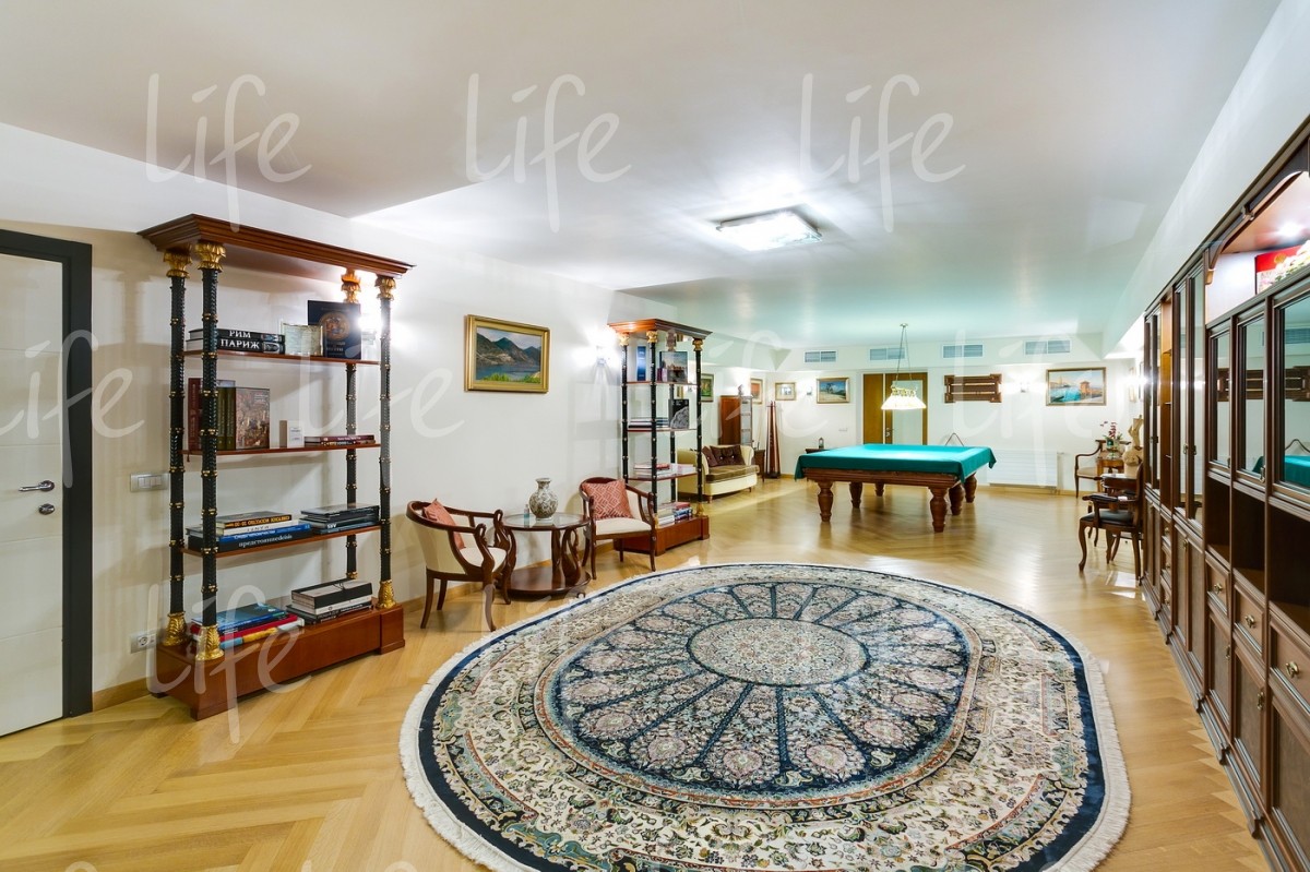 Основной дом 583 кв.м, гостевой дом 361 кв.м, подземный комплекс досуга и развлечений 1088кв.м: боулинг, бильярд, кинотеатр, конференц-зал, банный комплекс, бассейн, СПА-кабинет, тренажерный зал, танцевальный зал, библиотека, гараж, дом для персонала и охраны 210 кв.м.