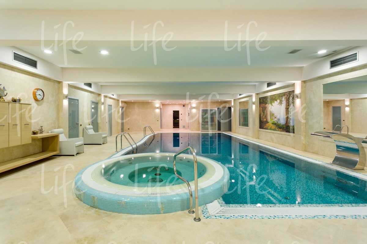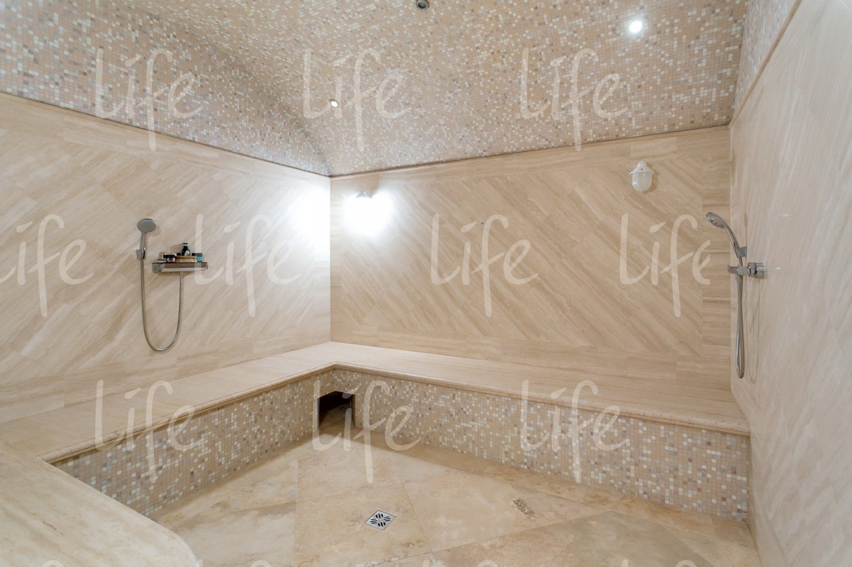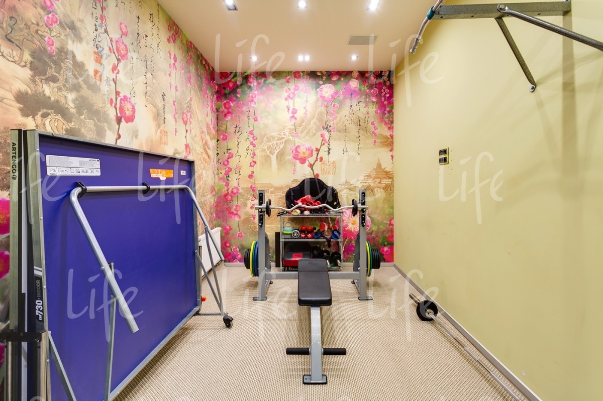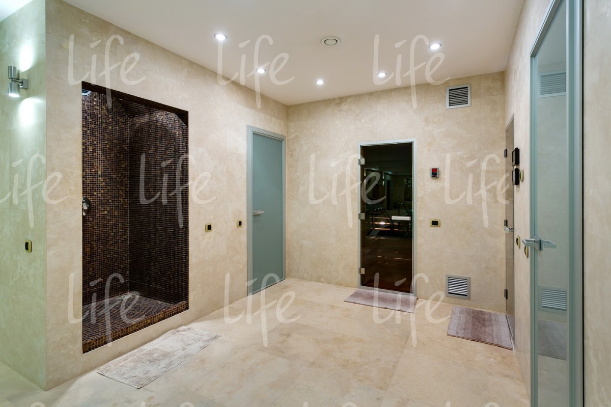 Основной дом 583 кв.м, гостевой дом 361 кв.м, подземный комплекс досуга и развлечений 1088кв.м: боулинг, бильярд, кинотеатр, конференц-зал, банный комплекс, бассейн, СПА-кабинет, тренажерный зал, танцевальный зал, библиотека, гараж, дом для персонала и охраны 210 кв.м.