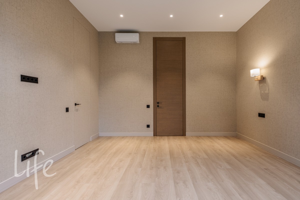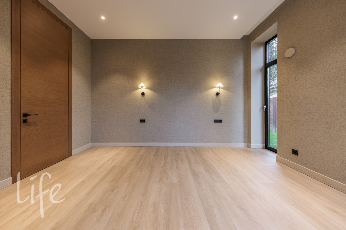 межкомнатные двери высотой три метра из шпона дуба, плитка Porselanosa, французские моющиеся краски Argile, текстильные обои в спальнях, встроенная кухня с островом, стеллажи из шпона дуба. Установлена шведская техника Acko и плита с вытяжкой Nikola Tesla. Во всех помещениях теплые водяные полы Rehau, внутрипольные конвекторы, котел Vaillant и бойлер на 300 литров.