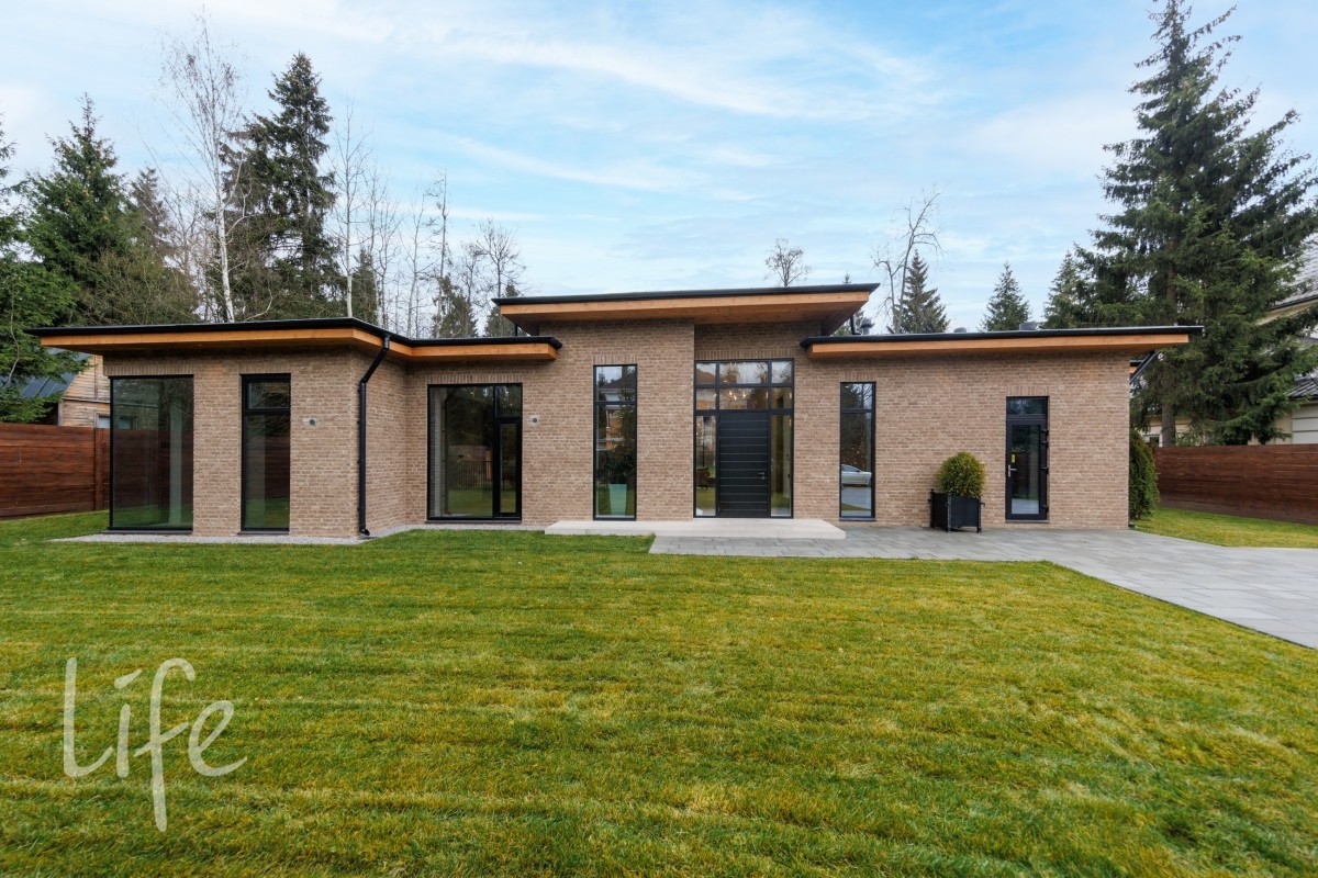 При строительстве дома использовались лучшие современные материалы. Фундамент — свайно-ростверковый, из бетона. Стены возведены из керамического блока и кирпича. Облицовка выполнена из вручную сформированного кирпича, уложенного по индивидуальному проекту. Окна панорамные — алюминиевые, энергоэффективные, с двойным стеклопакетом. Кровля — бесшумная битумная черепица Tegola.