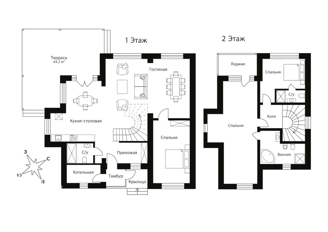 1 этаж: прихожая с гардеробной, кухня-столовая с выходом на террасу, гостиная, спальня, су с душем, котельная.