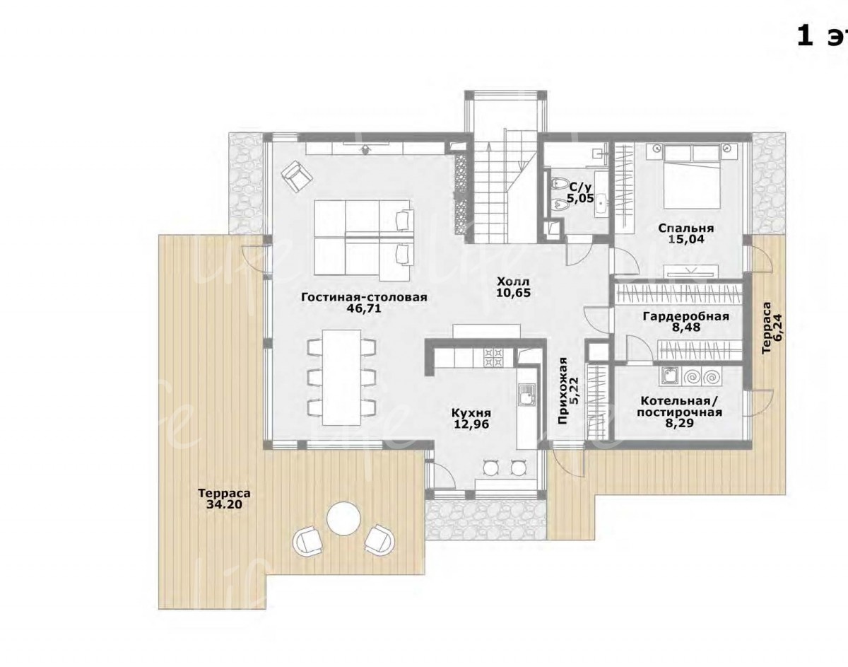 1 этаж: гостиная-столовая, кухня, холл, спальня, гардеробная, су, котельная, прихожая, терраса.