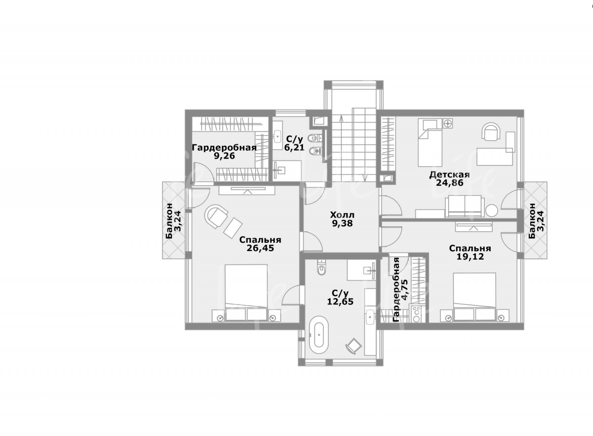 2 этаж: спальня, балкон, гардеробная, су, детская, спальня, балкон, гардеробная, холл, су.