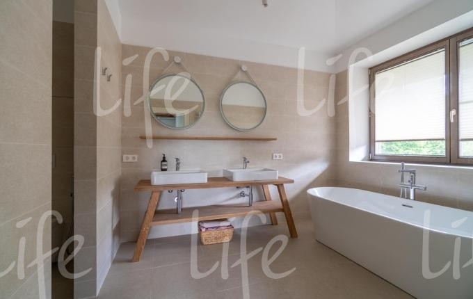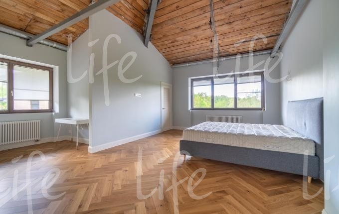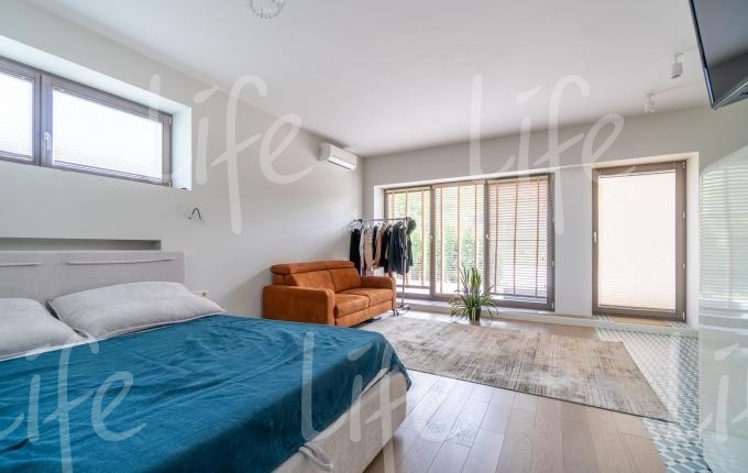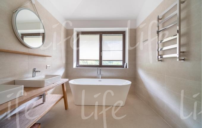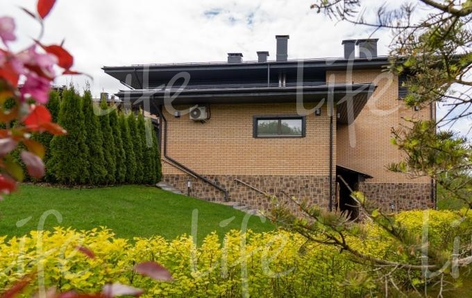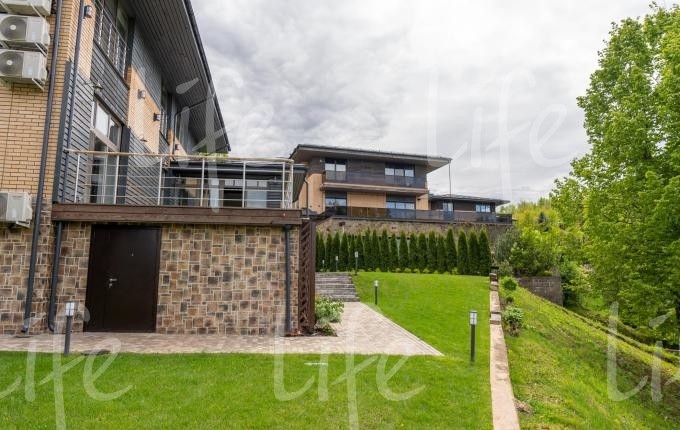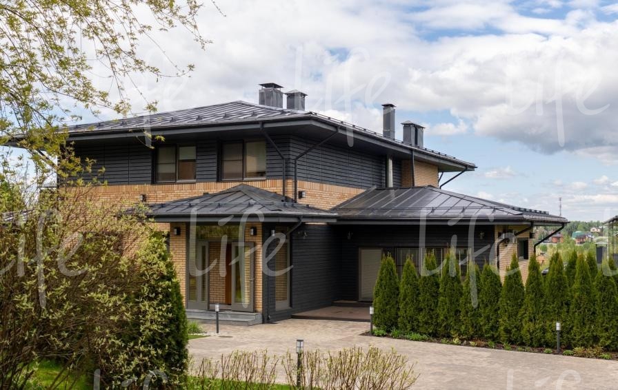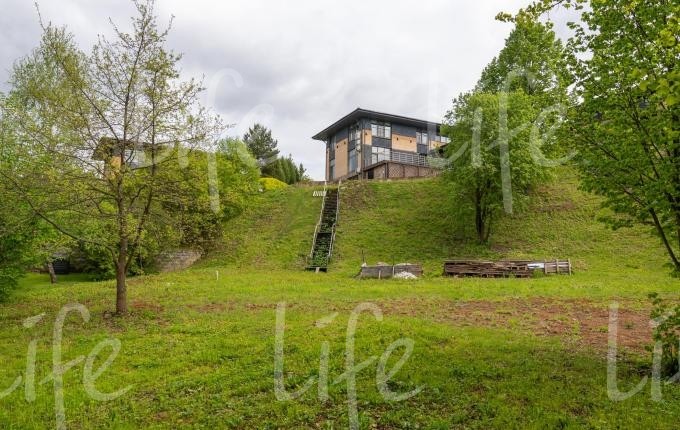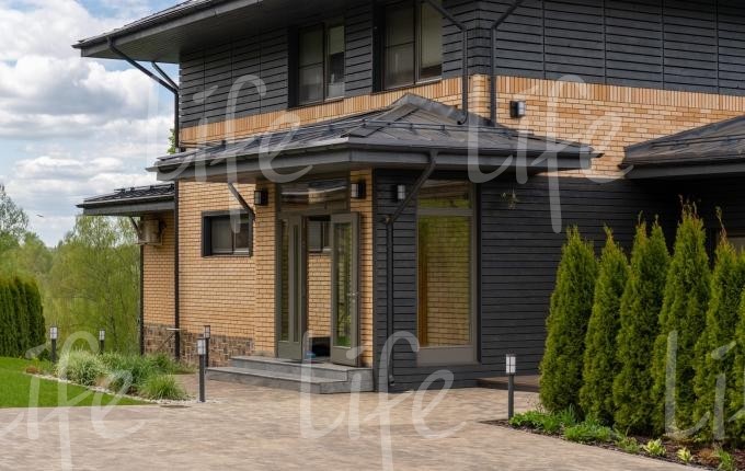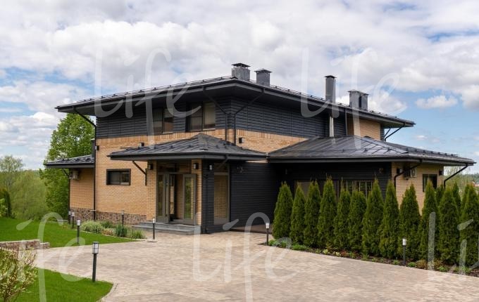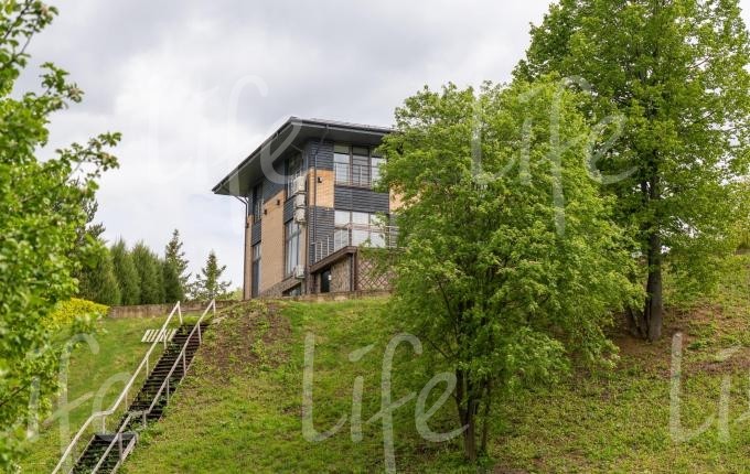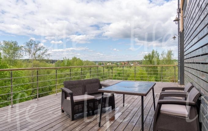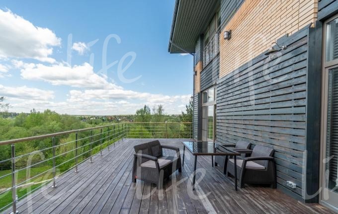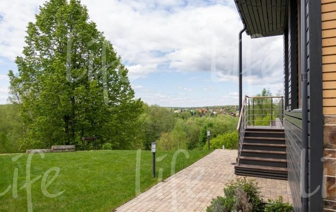 Новый элитный видовой дом на высоком берегу реки Пахра, архитектура в духе Фрэнка Ллойда Райта, с панорамными террасами: с одной из них открывается захватывающий вид на запад на несколько километров, создающий ощущение полёта. Дом сочетает высокое качество строительства, премиальные материалы, большие окна из лиственницы, все спальни со своими санузлами и гардеробными, есть гостевой блок, спа-зона, купель.