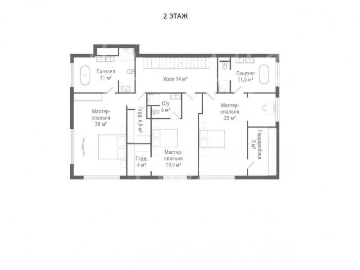 2 этаж: 3 мастер-спальни с гардеробными и су, холл.