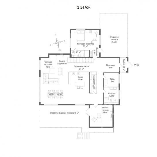 1 этаж: прихожая, гардеробная, су, кладовая, гостевая квартира с су, гостиная, кухня, террасы.
