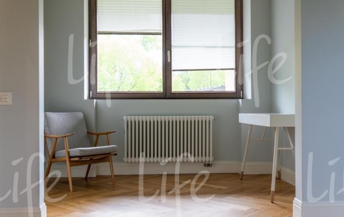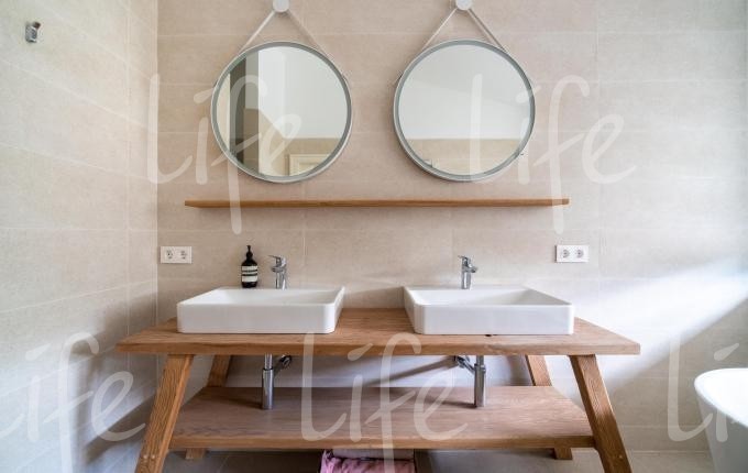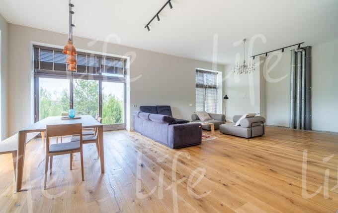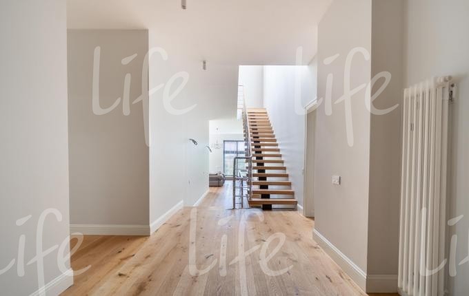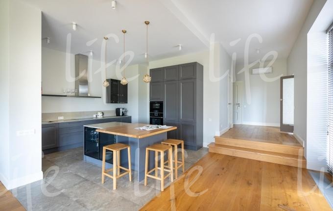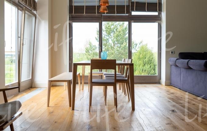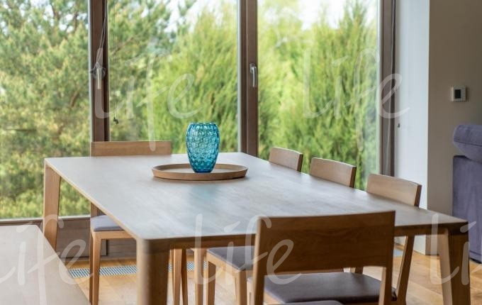 Отделка и меблировка выполнены в скандинавском стиле в светлых тонах с природной эстетикой: в доме много света, натуральные дорогостоящие материалы, мебель из
