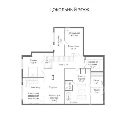 Цоколь: котельная, постирочная, гардеробная, сауна, хамам, спортзал, спальня с су.