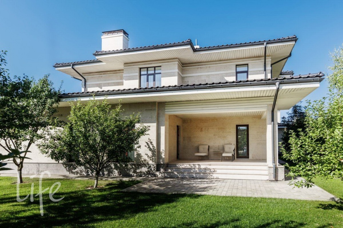 Коттеджный поселок премиум-класса «Ренессанс парк». Новый дом, полностью под ключ, меблирован и оборудован всей необходимой бытовой техникой. В стиле Фрэнка Ллойда Райта, фасад облицован натуральным камнем.