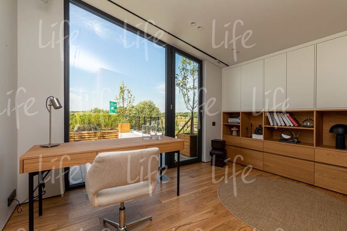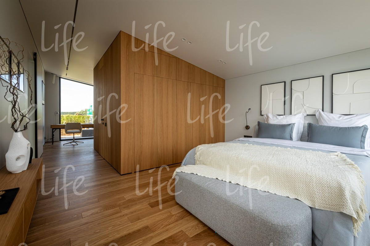 2 этаж: холл, кабинет, мастер-спальня с су, детская спальня с су, балкон, терраса.