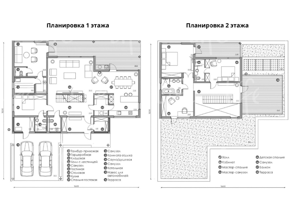1 этаж: прихожая, гардеробная, столовая, холл, столовая, гостиная, столовая, кухня, гостевая спальня, су, комната отдыха, котельная, терраса, навес на 2 мм.