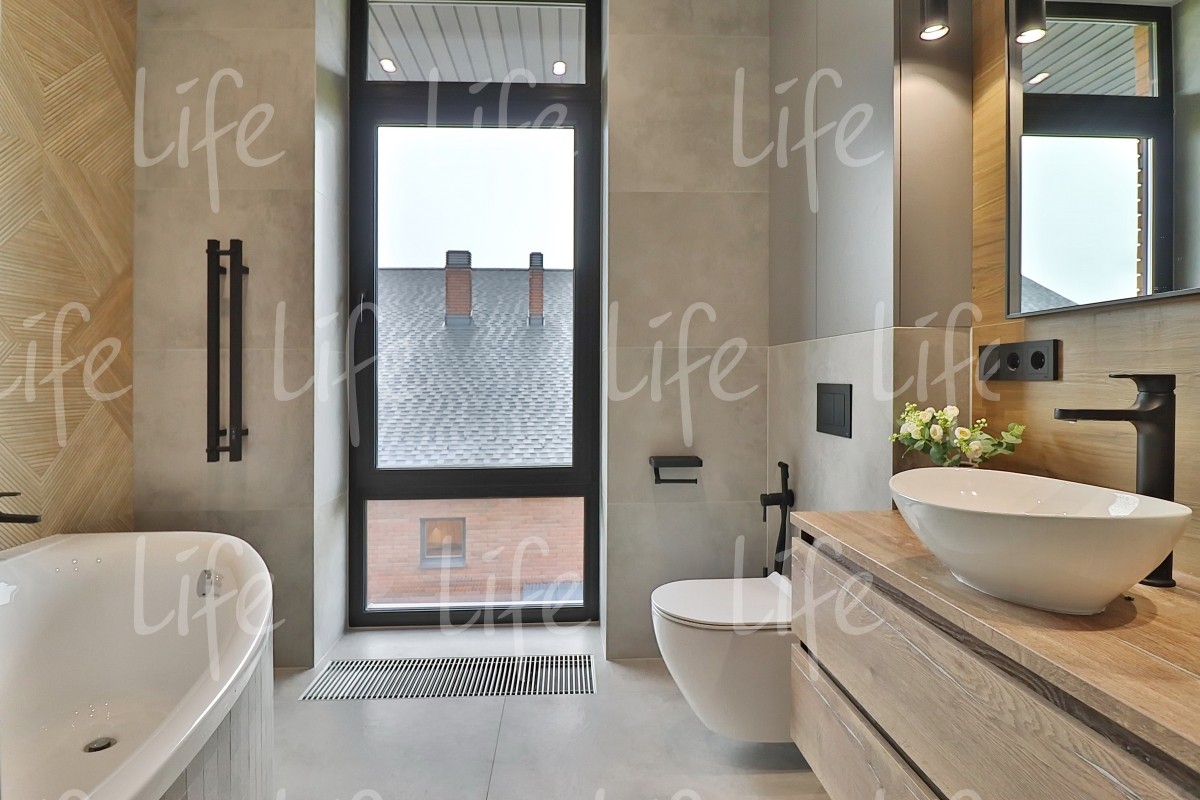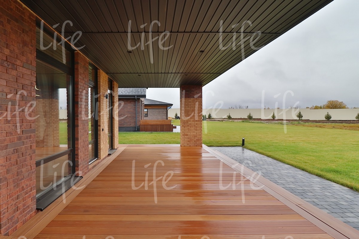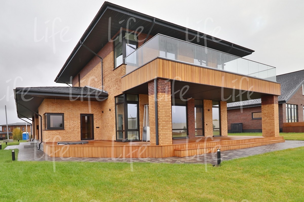 Конструктив: монолитный фундамент и межэтажные перекрытия, стены — керамический блок Porotherm с облицовкой кирпичом премиальной коллекции, 5-камерные окна с двухсторонней ламинацией, мягкая кровля, терраса — натуральная лиственница.