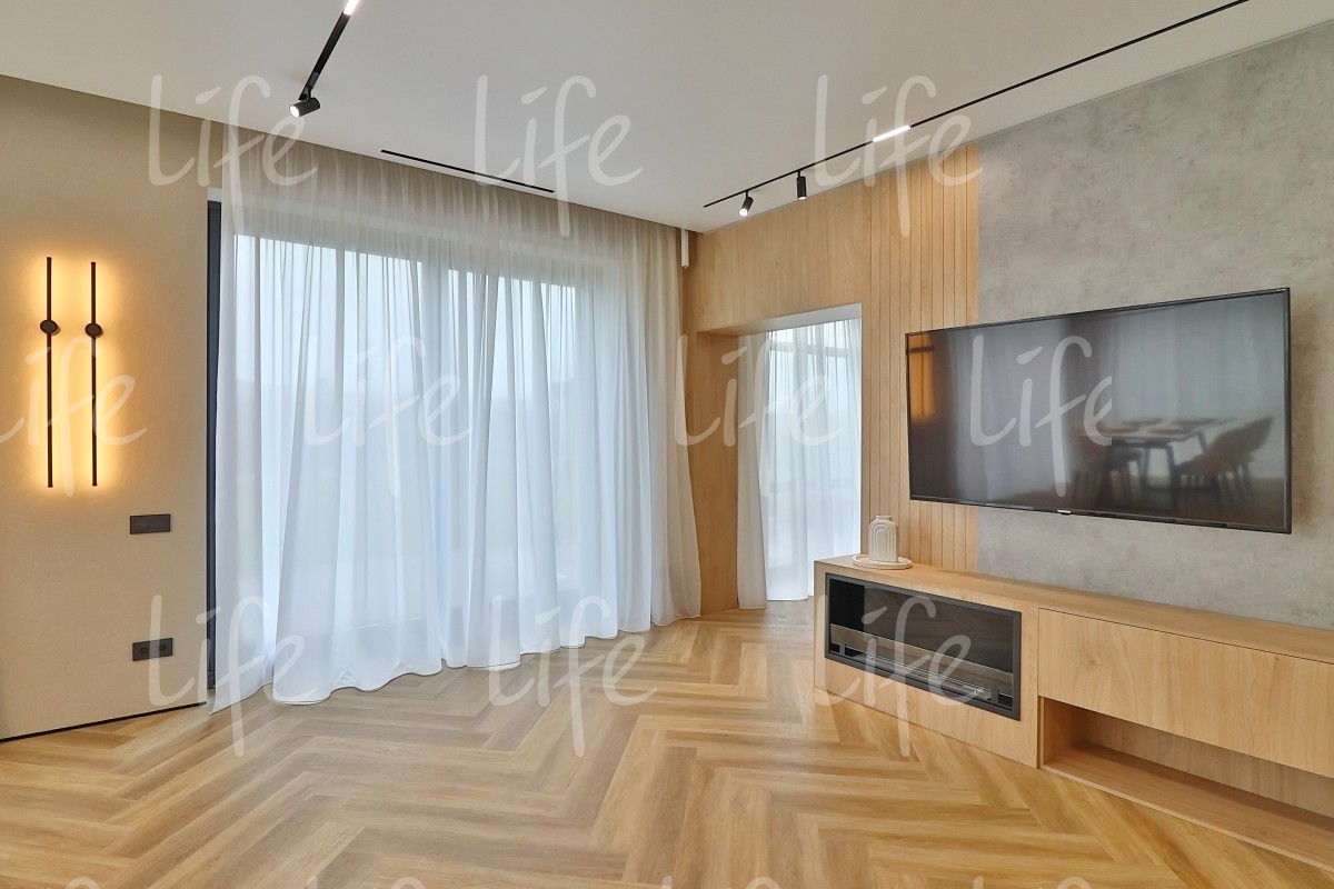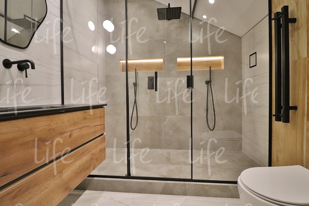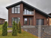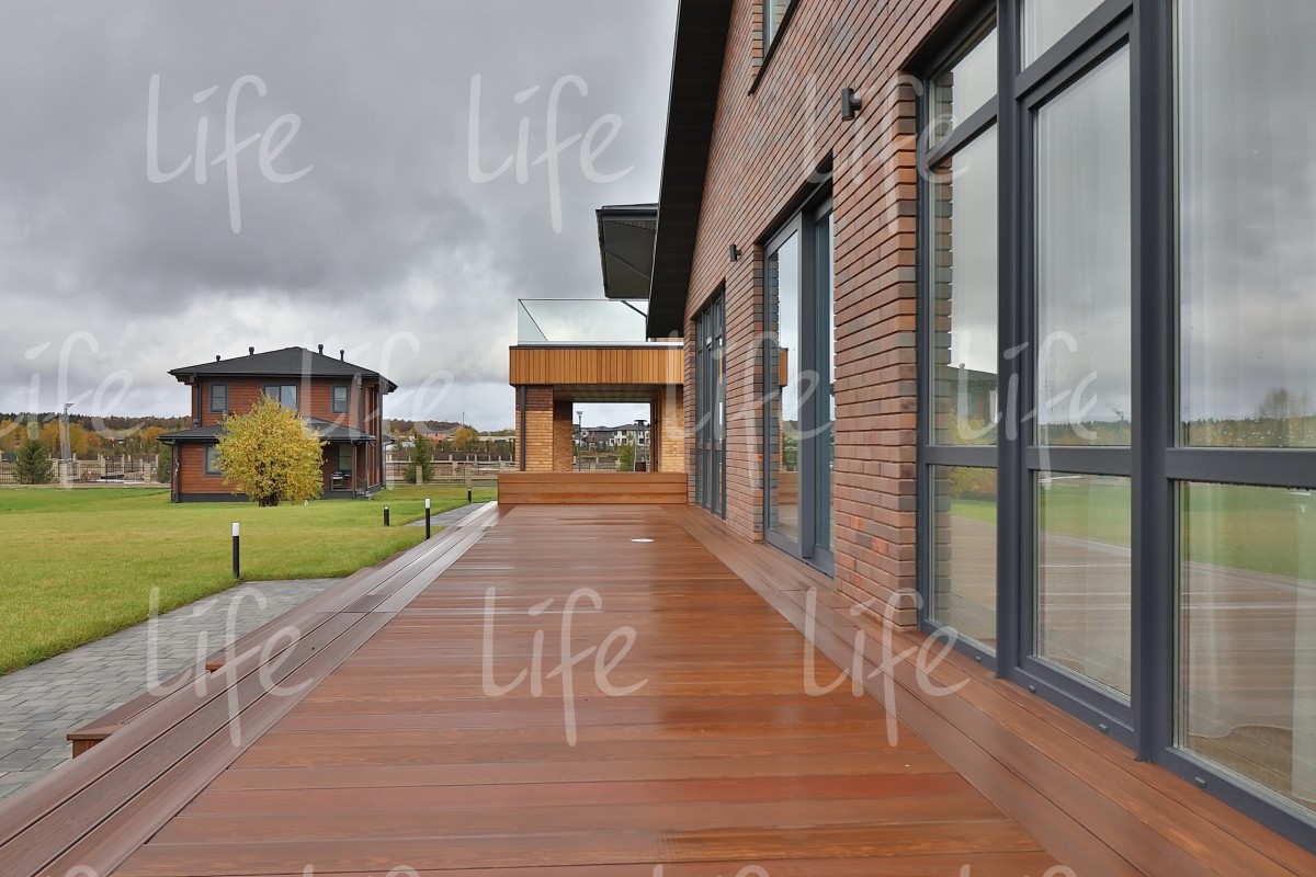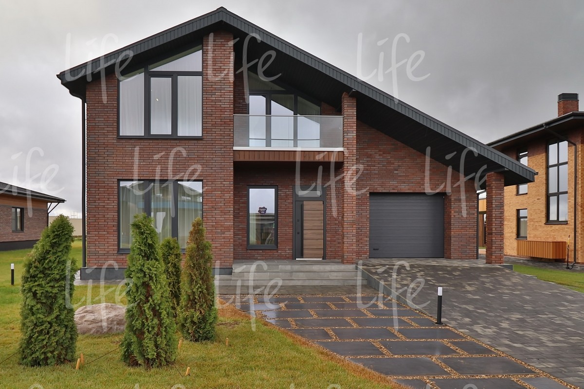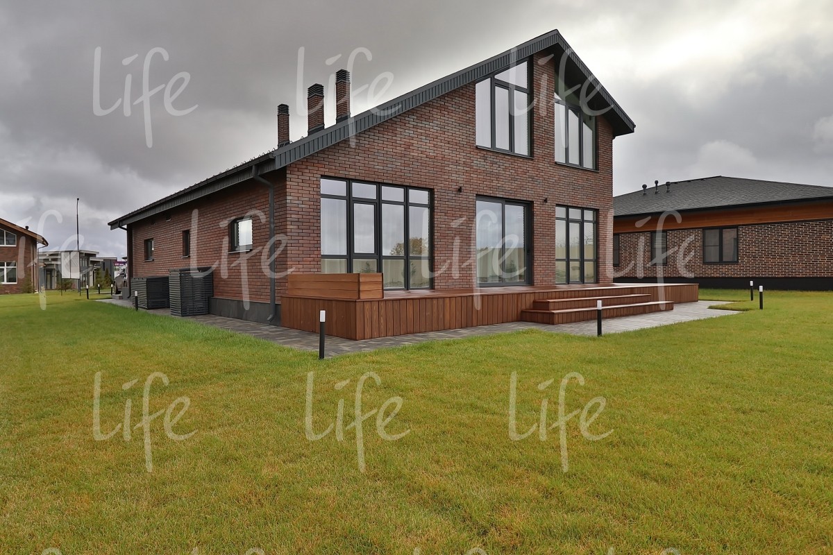 Конструктив: монолитный фундамент и межэтажные перекрытия, стены — керамический блок Porotherm с облицовкой кирпичом премиальной коллекции, 5-камерные окна с двухсторонней ламинацией, мягкая кровля, терраса — натуральная лиственница.