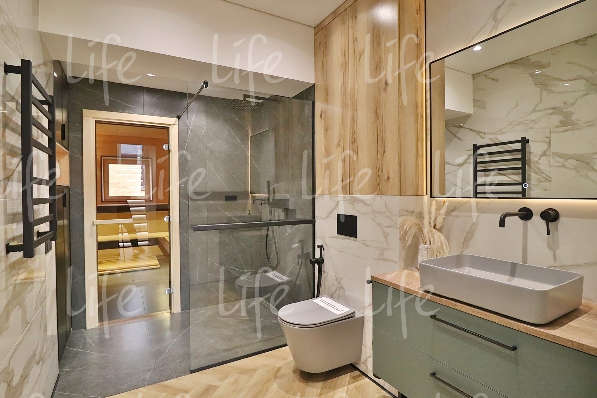 2 этаж: холл, две мастер-спальни с с/у и гардеробными, две спальни с с/у, балконы.