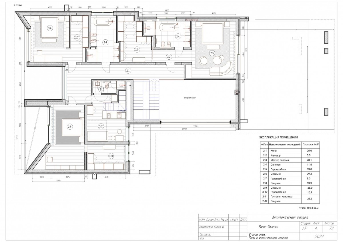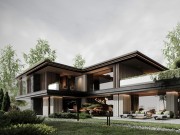 2 этаж: холл, спальня со своим с/у и гардеробной, спальня со своим с/у, гардеробной и 2 балконами, мастер-спальня с гардеробной, ванной комнатой и большой террасой с видом на лес, квартира для персонала с отдельным входом.