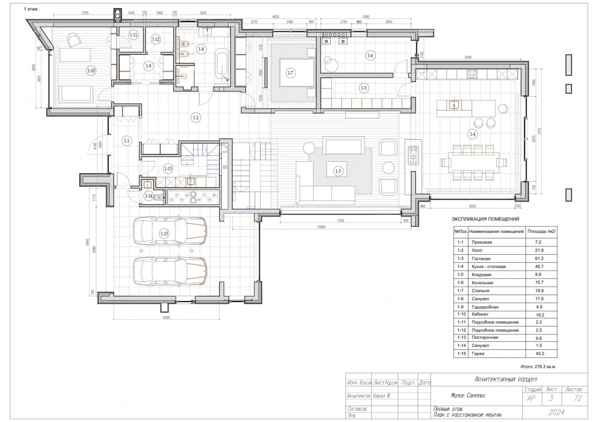 1 этаж: прихожая, гардеробная, с/у, кабинет, гостиная с камином и вторым светом, кухня-столовая, кладовая, спальня, постирочная, котельная, с/у, гараж на 2 м/м.