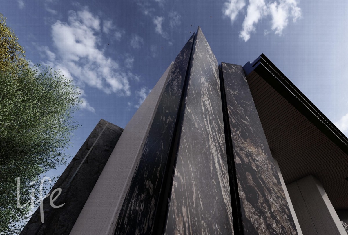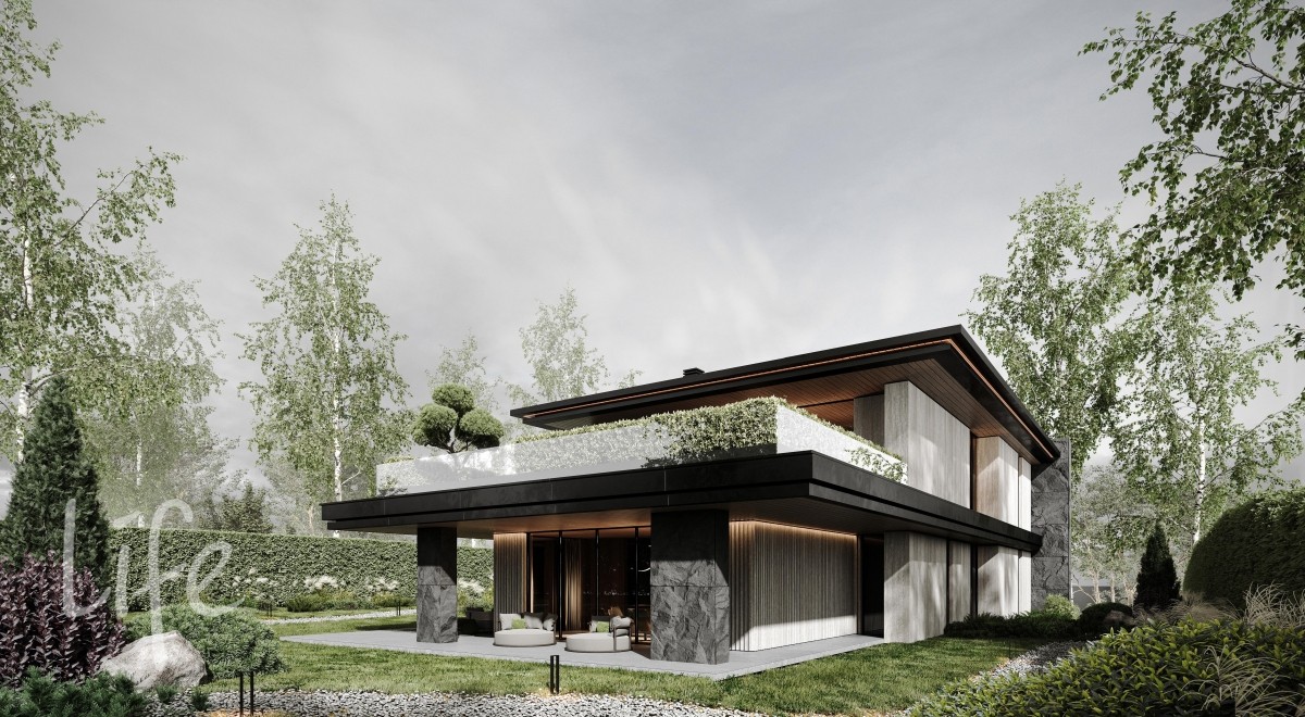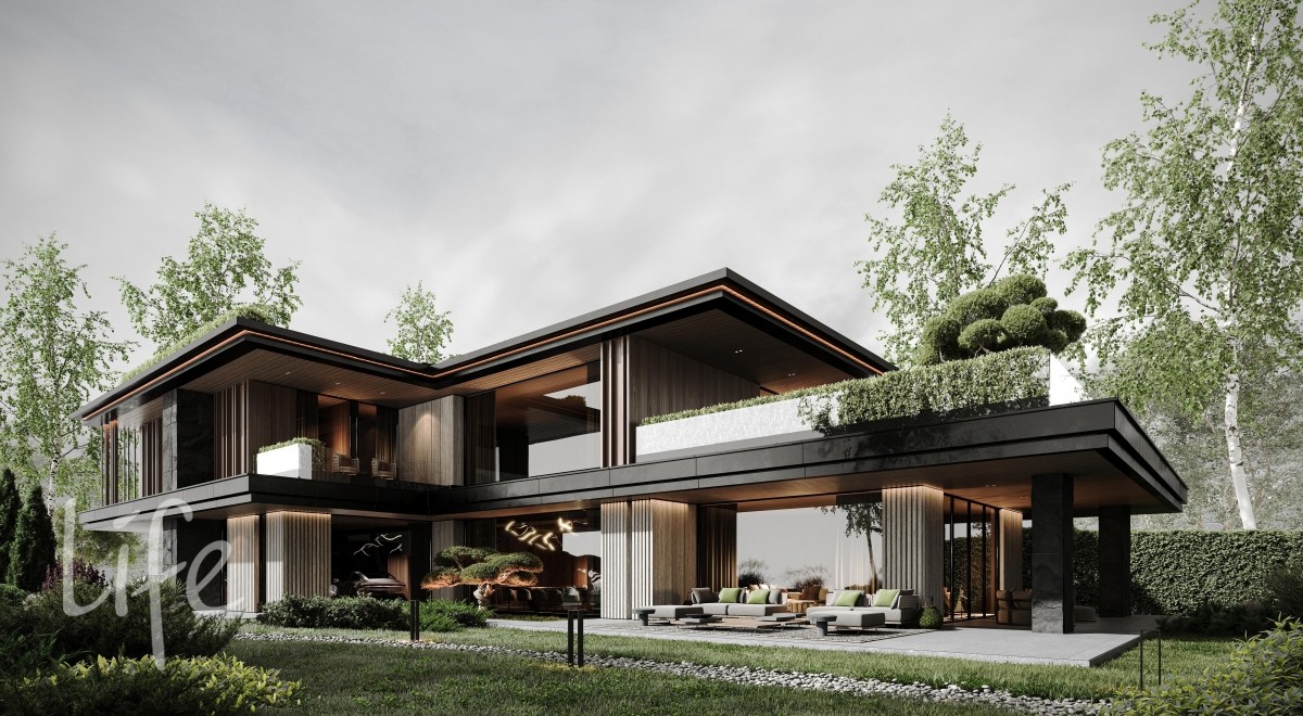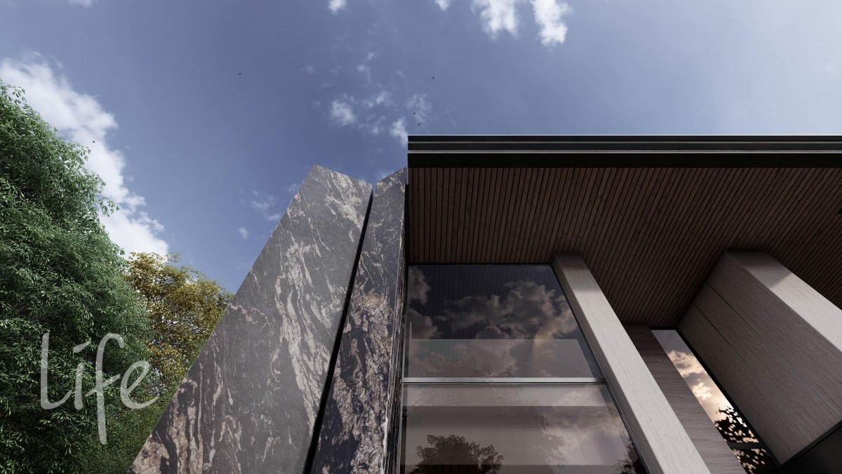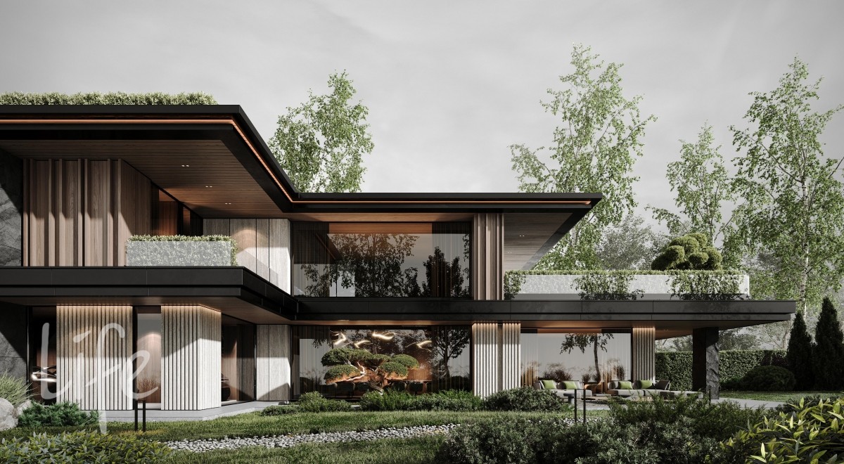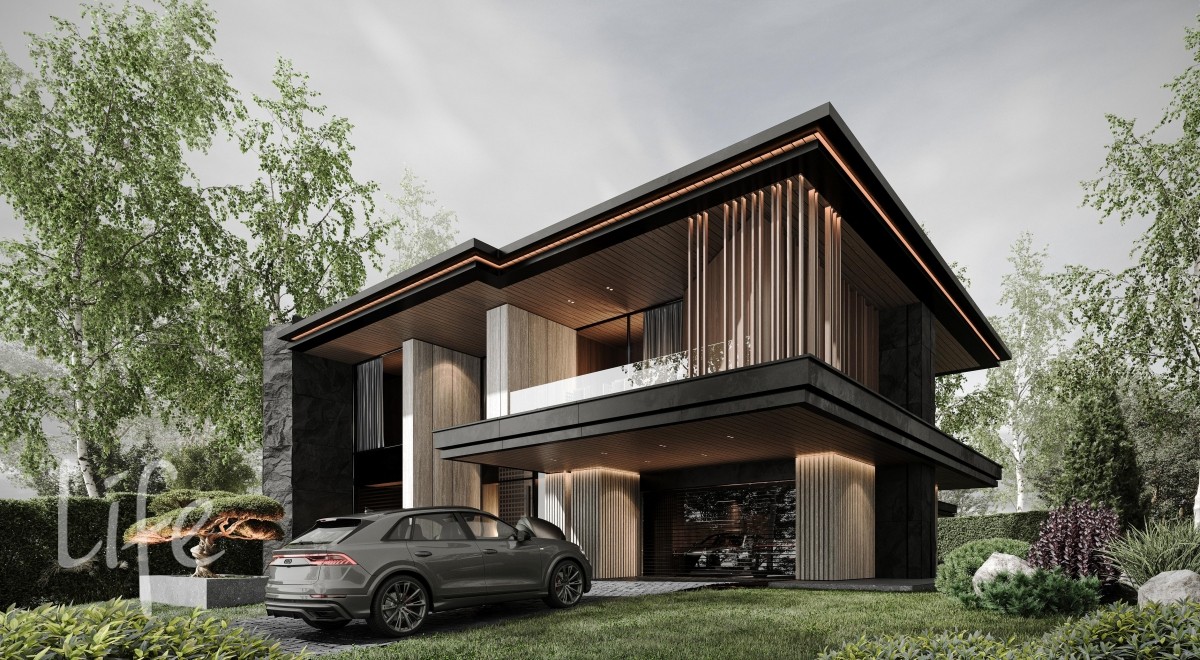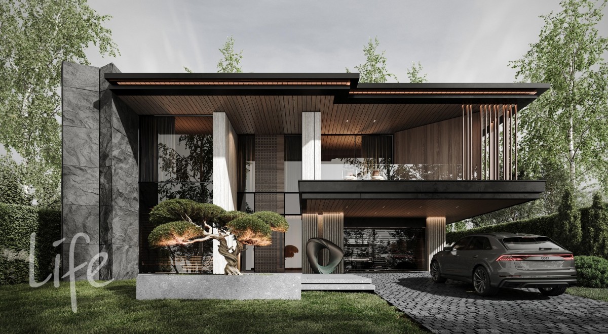 Архитектура здания выполнена в современном стиле с панорамным остеклением и комбинацией натурального гранита с термодеревом на фасаде. Есть архитектурная подсветка фасада.