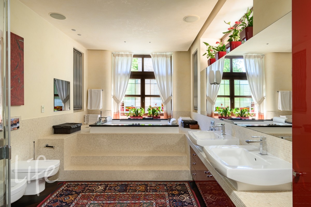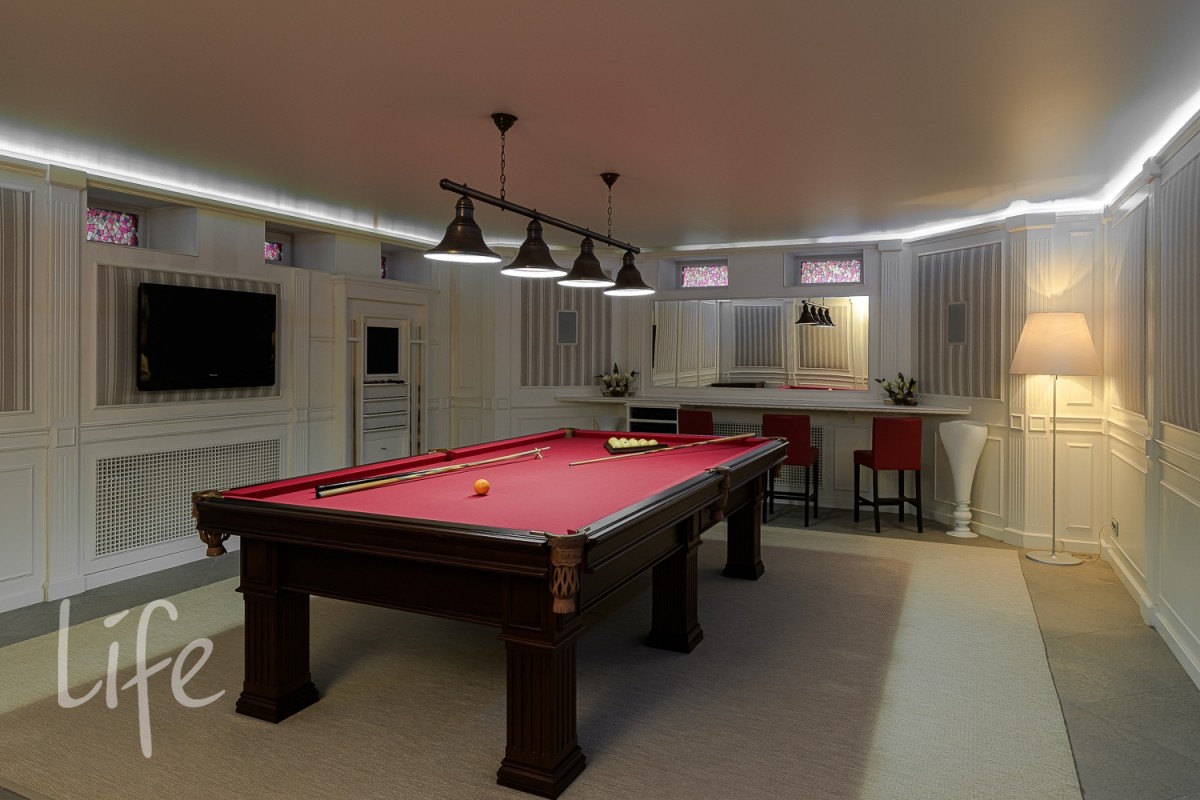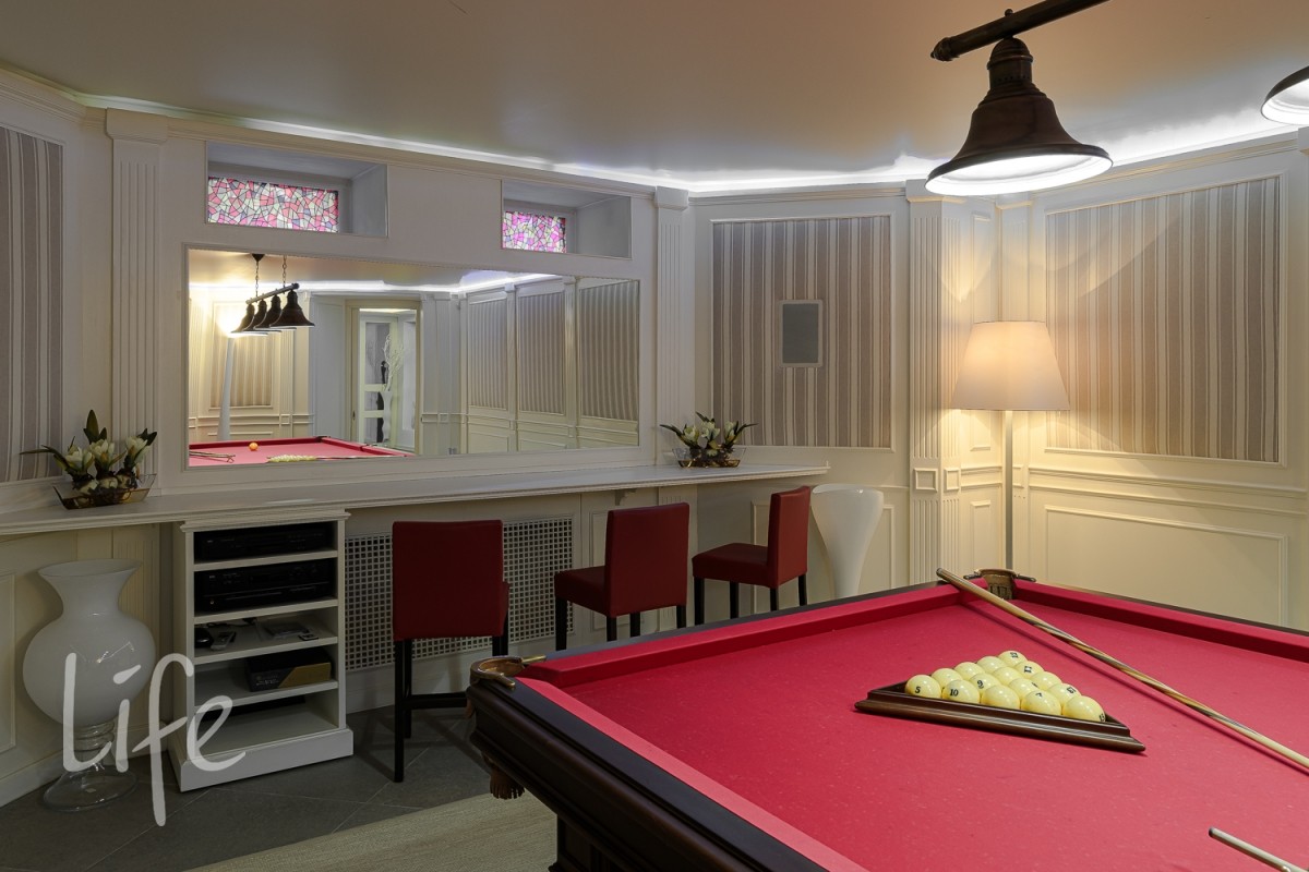 Цоколь: спортзал, с/у, домашний кинотеатр, бильярдная, бар, винный погреб, постирочная, котельная, лифт для продуктов на первый этаж.