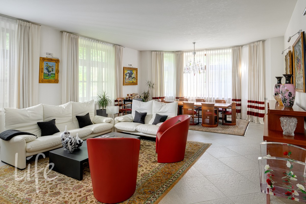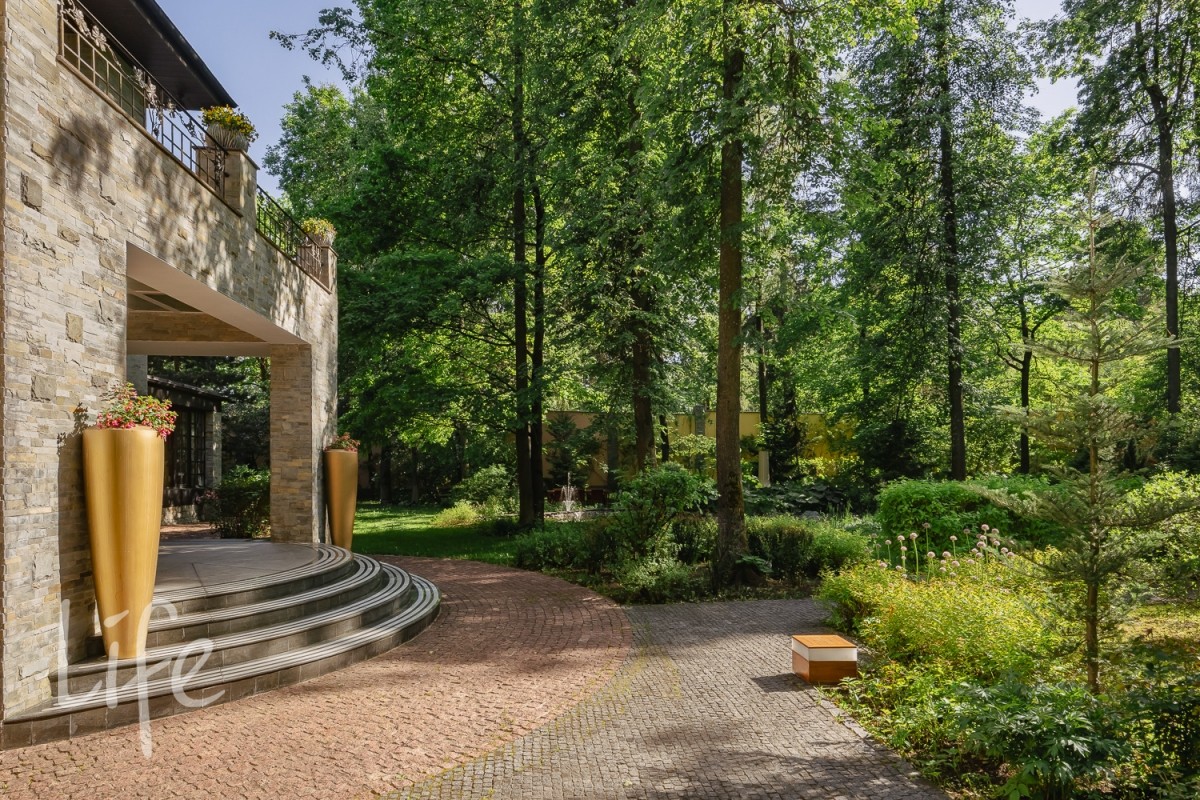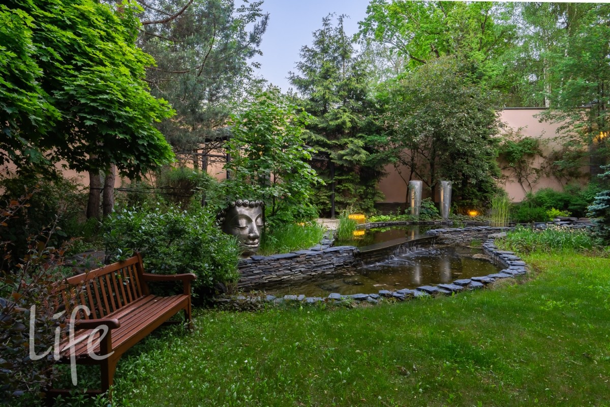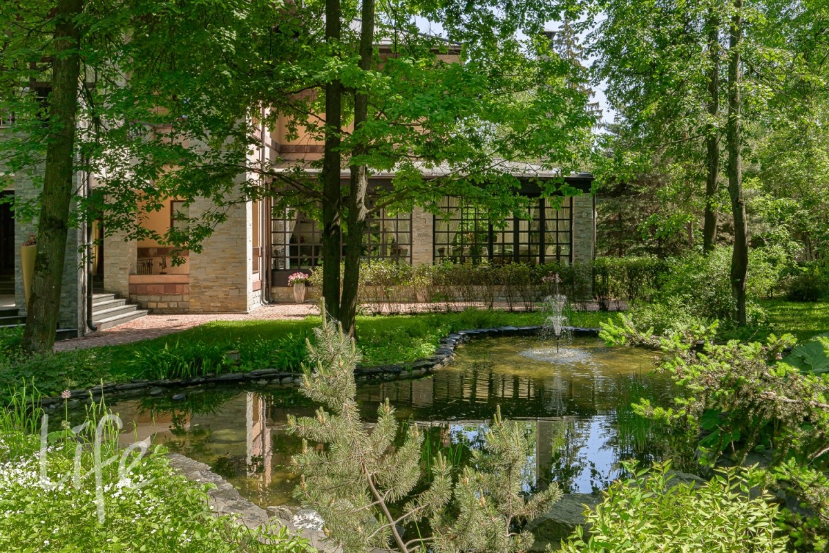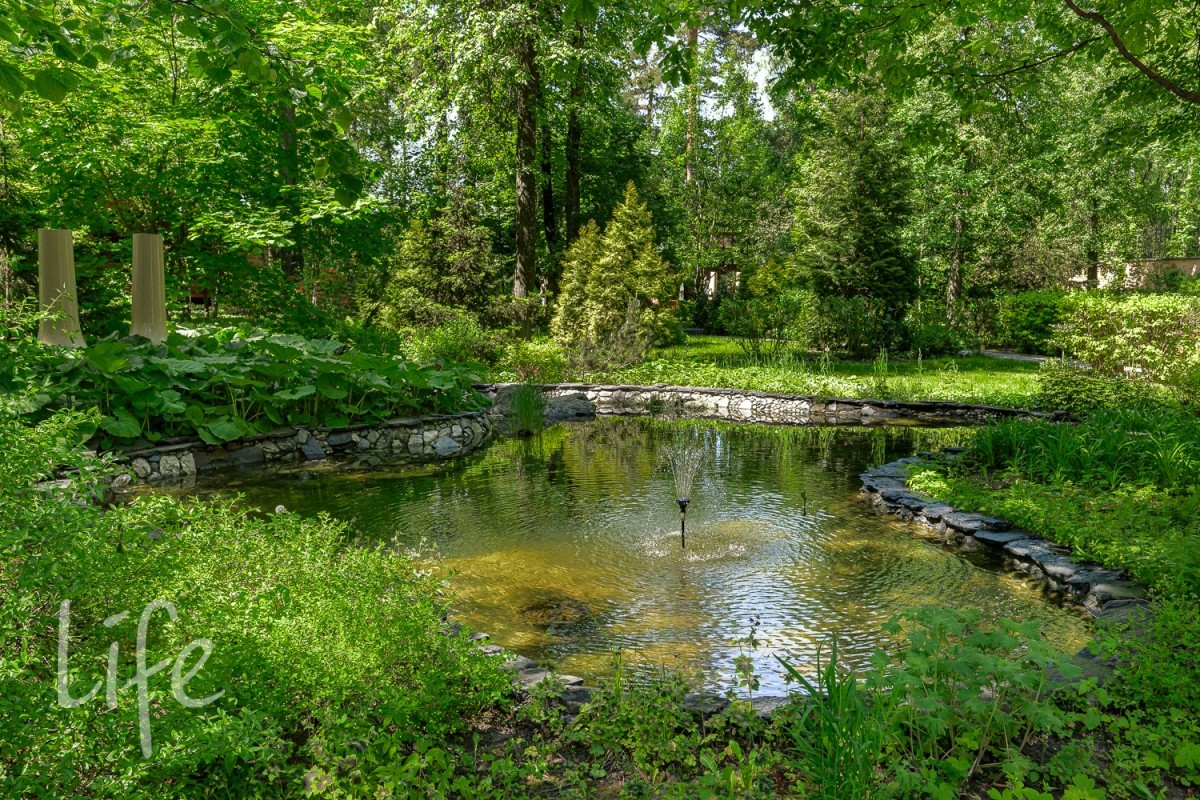 Красивый лесной участок с ландшафтным дизайном, каскад прудов с рыбками, ручей, прогулочные дорожки и уличное освещение. Гостевая парковка и отдельно стоящий гараж на две машины.