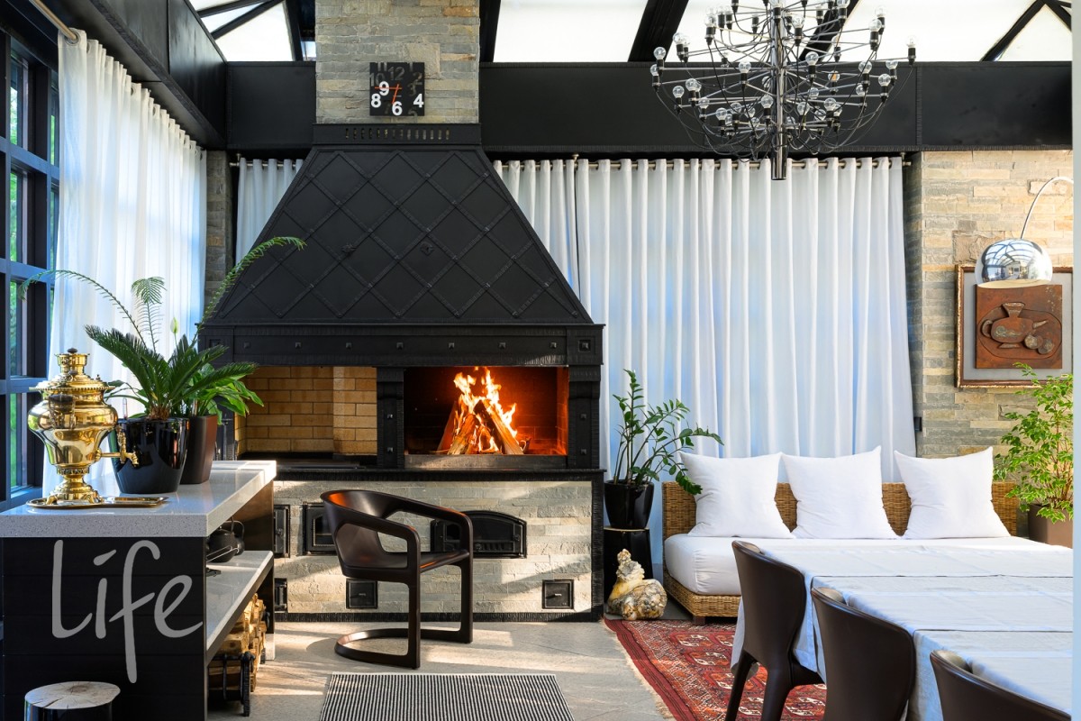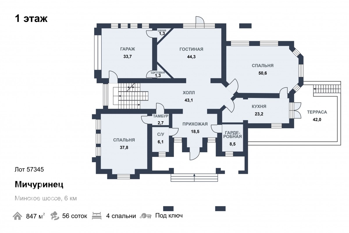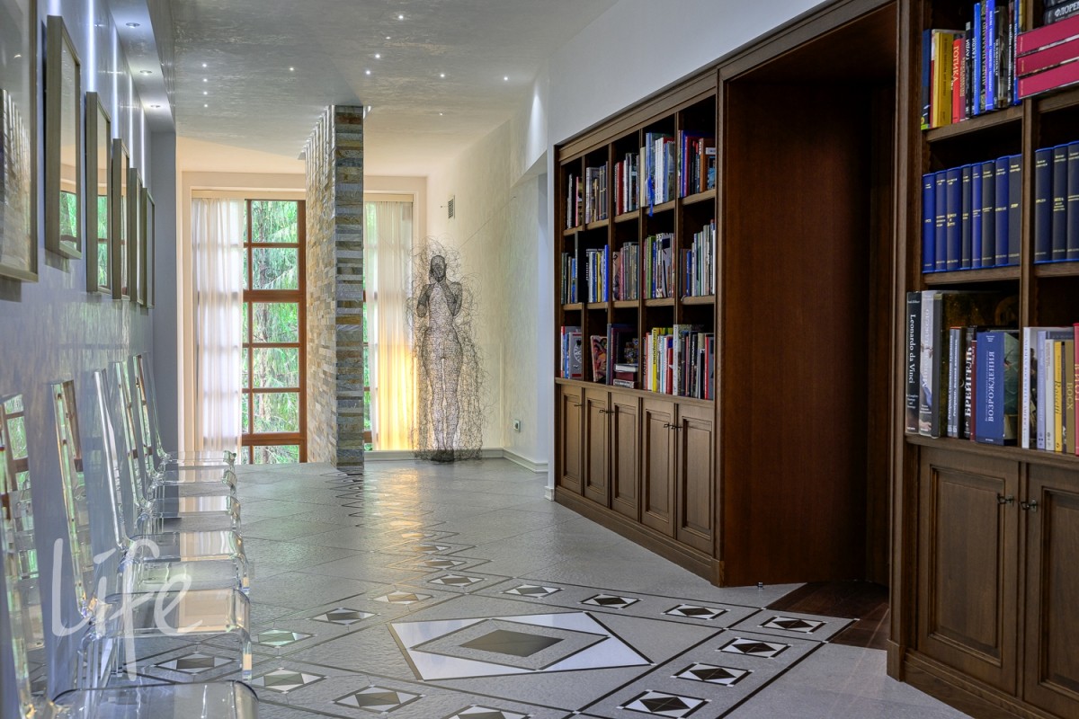 1 этаж: холл, гардеробная, кухня столовая с панорамным остеклением, мангал, гостиная, кабинет, каминный зал, библиотека, оранжерея.