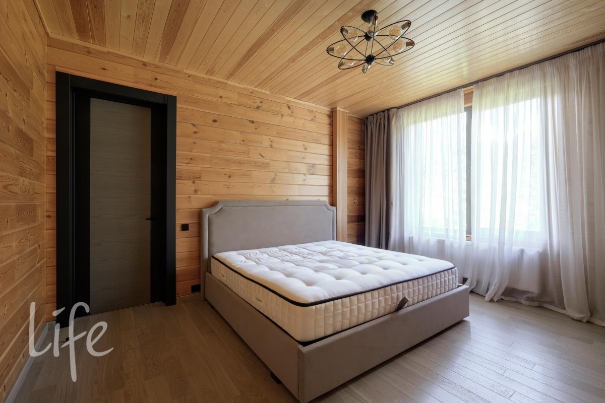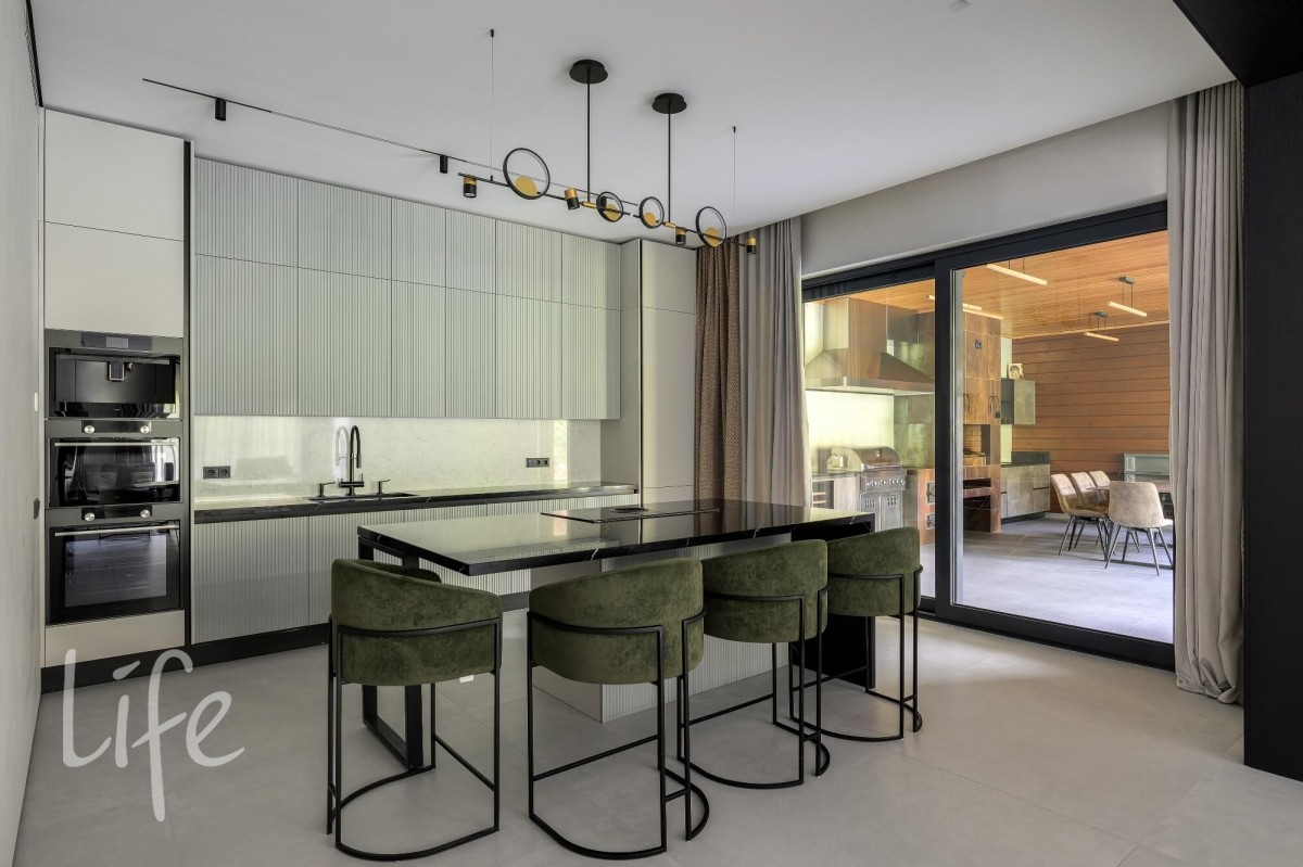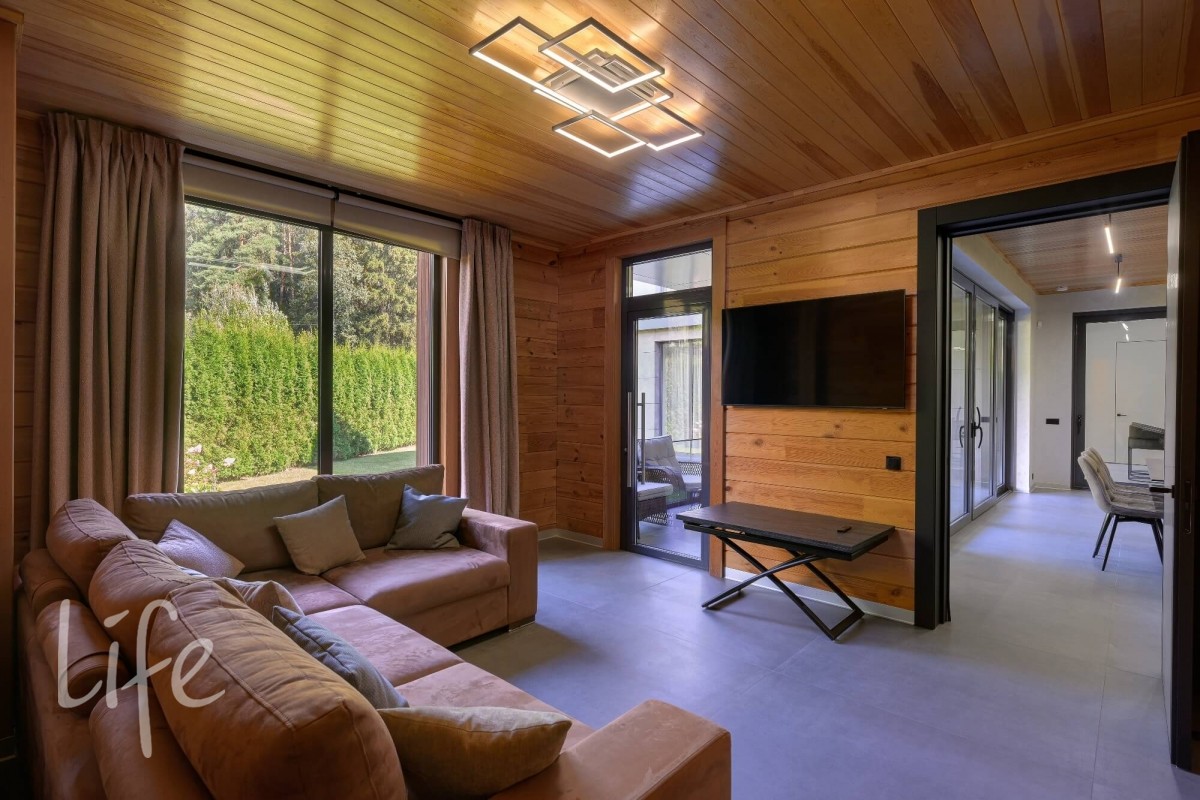 Конструктив - полнотелый кирпич, панорамные окна, авторская отделка, паровой камин, премиальная сантехника и бытовая техника, теплые полы, видеонаблюдение. Фишка - собственная калитка в лес.