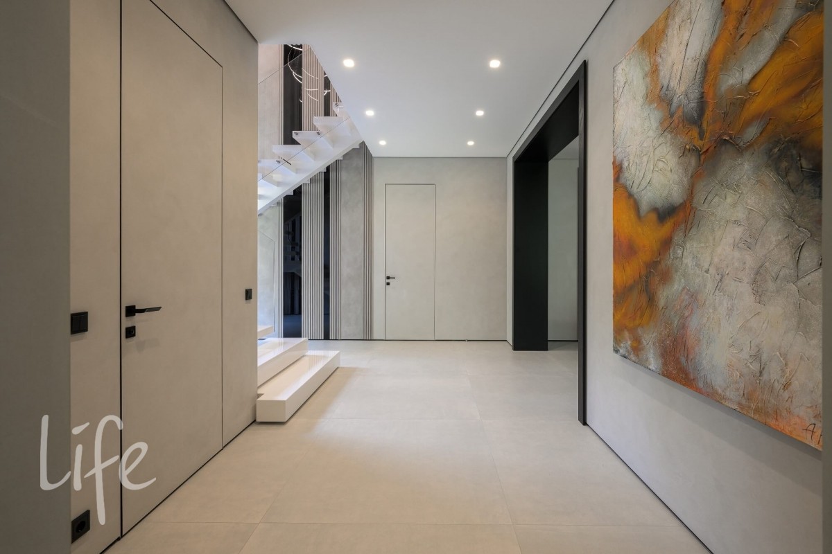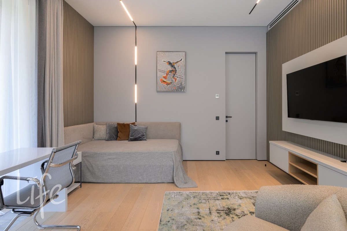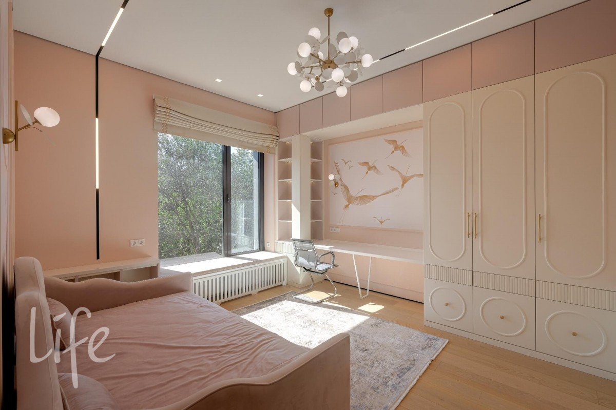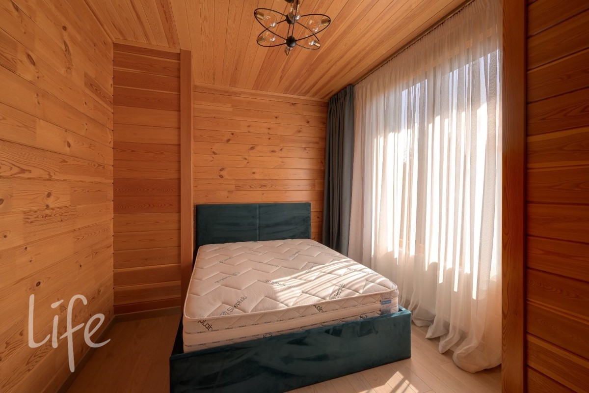 Конструктив - полнотелый кирпич, панорамные окна, авторская отделка, паровой камин, премиальная сантехника и бытовая техника, теплые полы, видеонаблюдение. Фишка - собственная калитка в лес.
