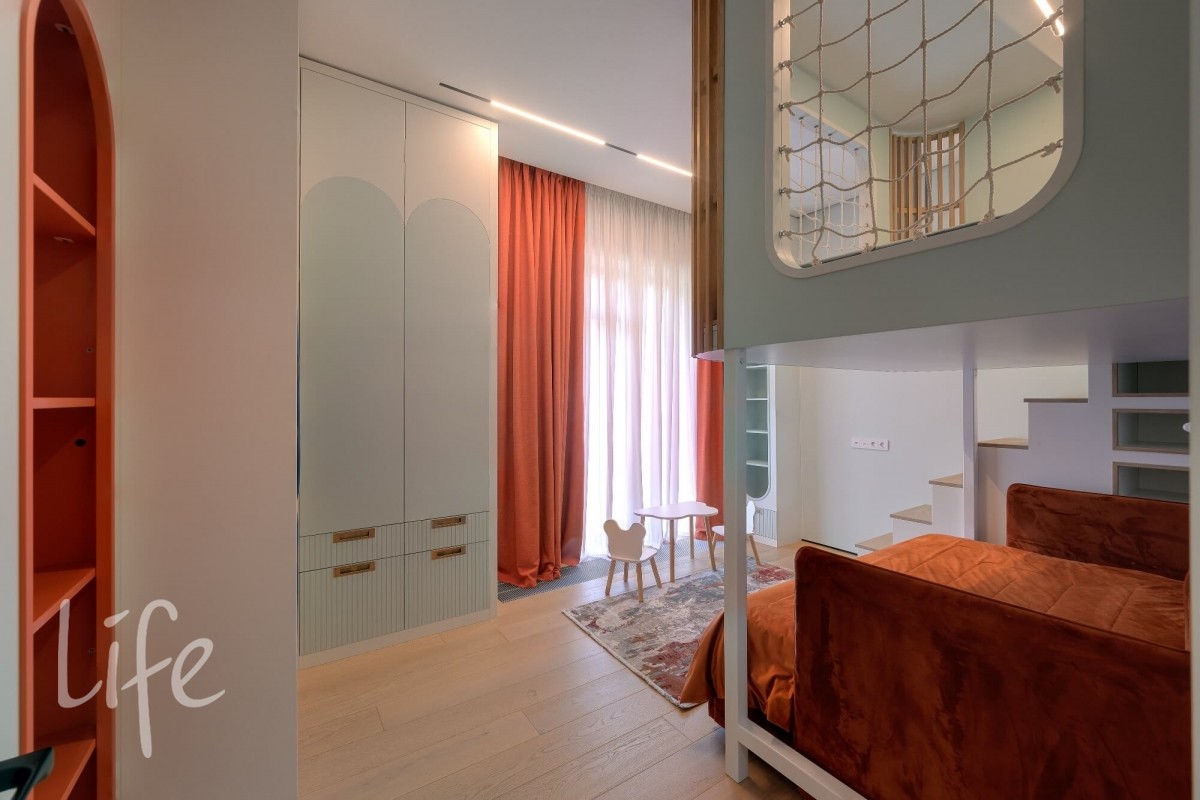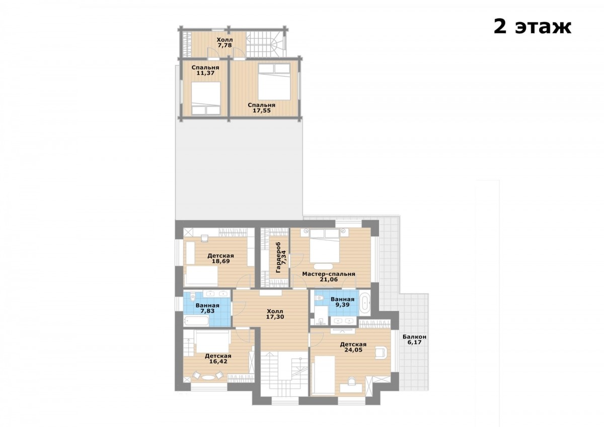 2 этаж: мастер-спальня (21,1) с гардеробной (7,3), ванной комнатой (9,4) и балконом (6,17). Детские (24 + 18,7 + 16,4), общая ванная комната (7,8), холл (17,3).