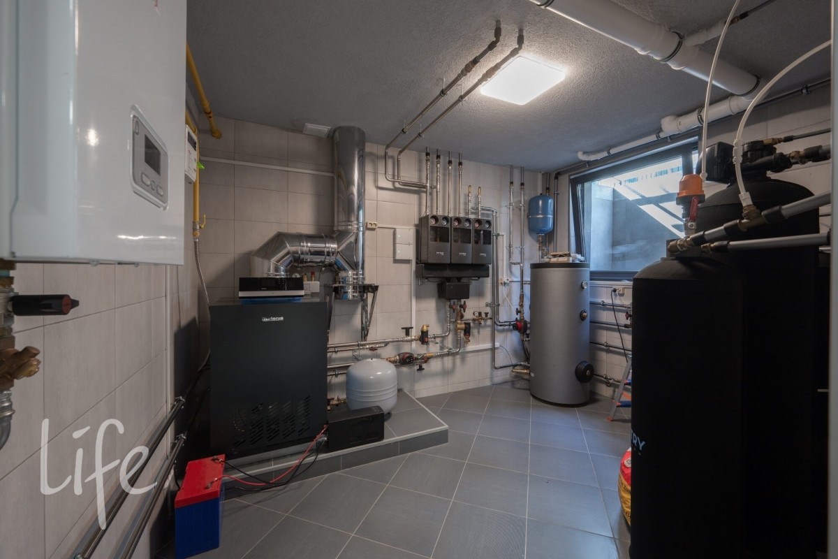 На участке расположен основной дом, который архитектурно объединен второй гостиной с большой баней из клееного бруса (429 кв.м), гараж на 2 м/м с раздвижной стенкой из стекла (35 кв.м), отапливаемый хоз.блок с двумя помещениями (15 кв.м) и аутентичный колодец с питьевой водой.