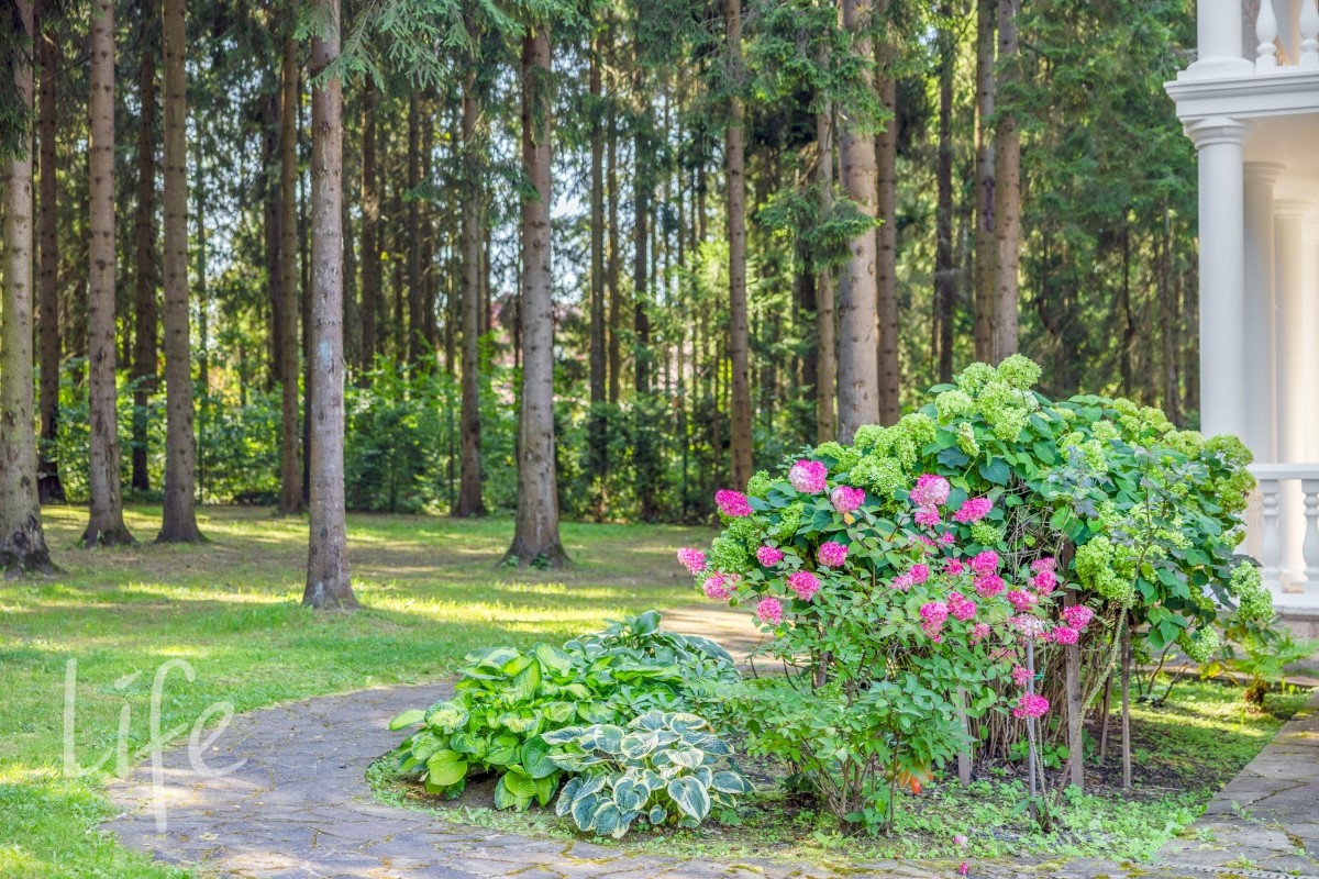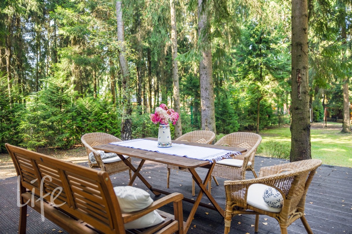 На участке оборудована деревянная детская площадка, теннисный стол, зона для отдыха, небольшой аптекарский огород, клумбы с цветами и ухоженный газон.