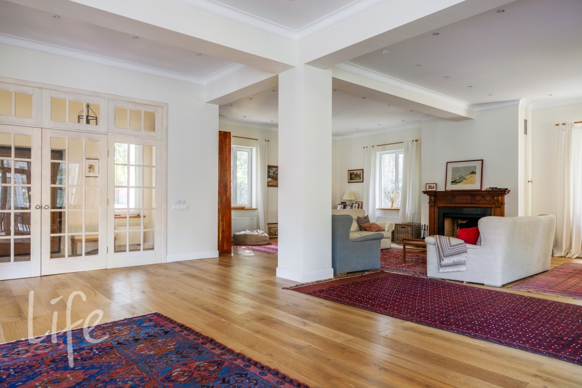1 этаж: уютная гостиная с большим камином и антикварным английским деревянным порталом, современная кухня, объединённая с гостиной, отапливаемый зимний сад и просторная летняя терраса с летней мебелью и выходом в сад, ванная комната с сауной, бочкой и гостевым су.