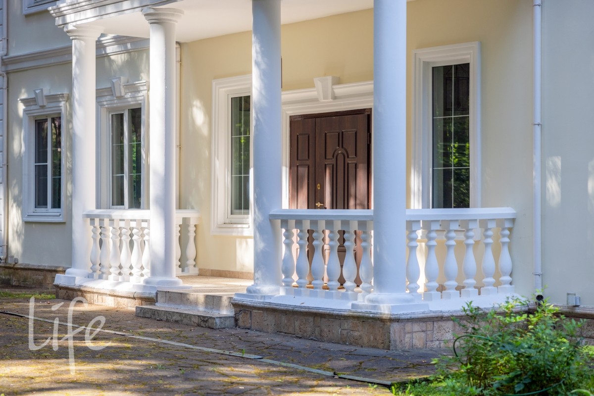 Дом выполнен в классическом стиле с колоннами и лепным декором и балюстрадами, построен из капитального материала - газобетона, снаружи покрытый декоративной штукатуркой. Цвет дома идентичен с цветом фасада «Русского музея» в Санкт-Петербурге.