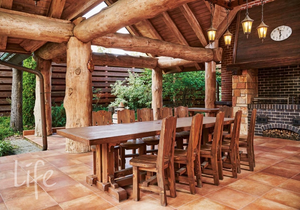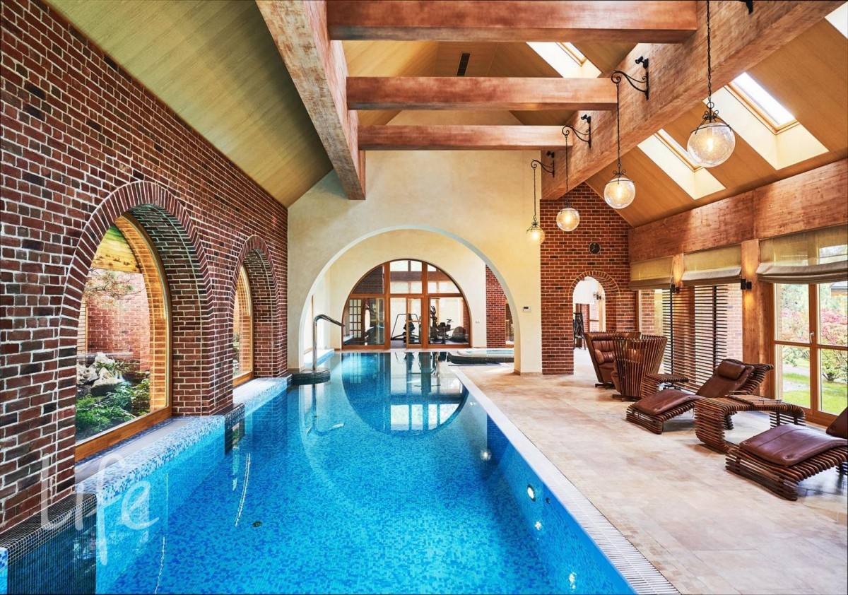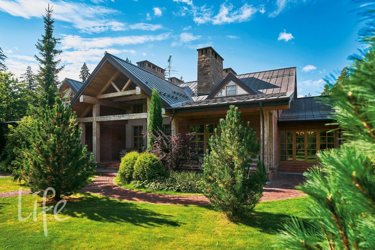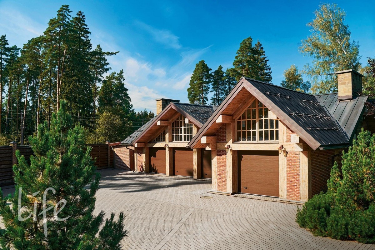 Широкие силуэты крыш с мощной системой стропил из хвойных пород деревьев органично сливаются с кронами вековых деревьев, создавая гармоничный ансамбль, где кирпичная кладка сочетается с бревнами ручной рубки.
