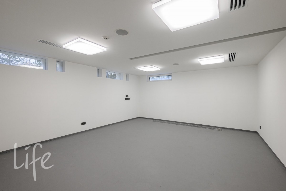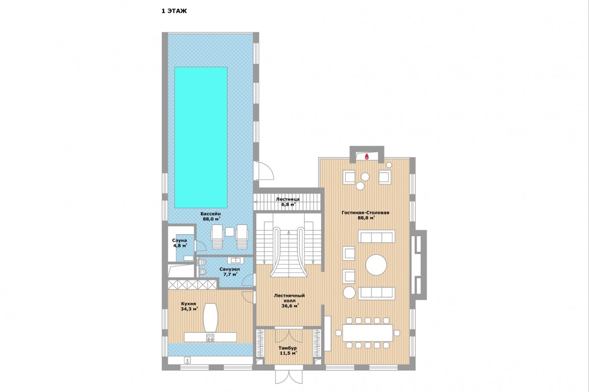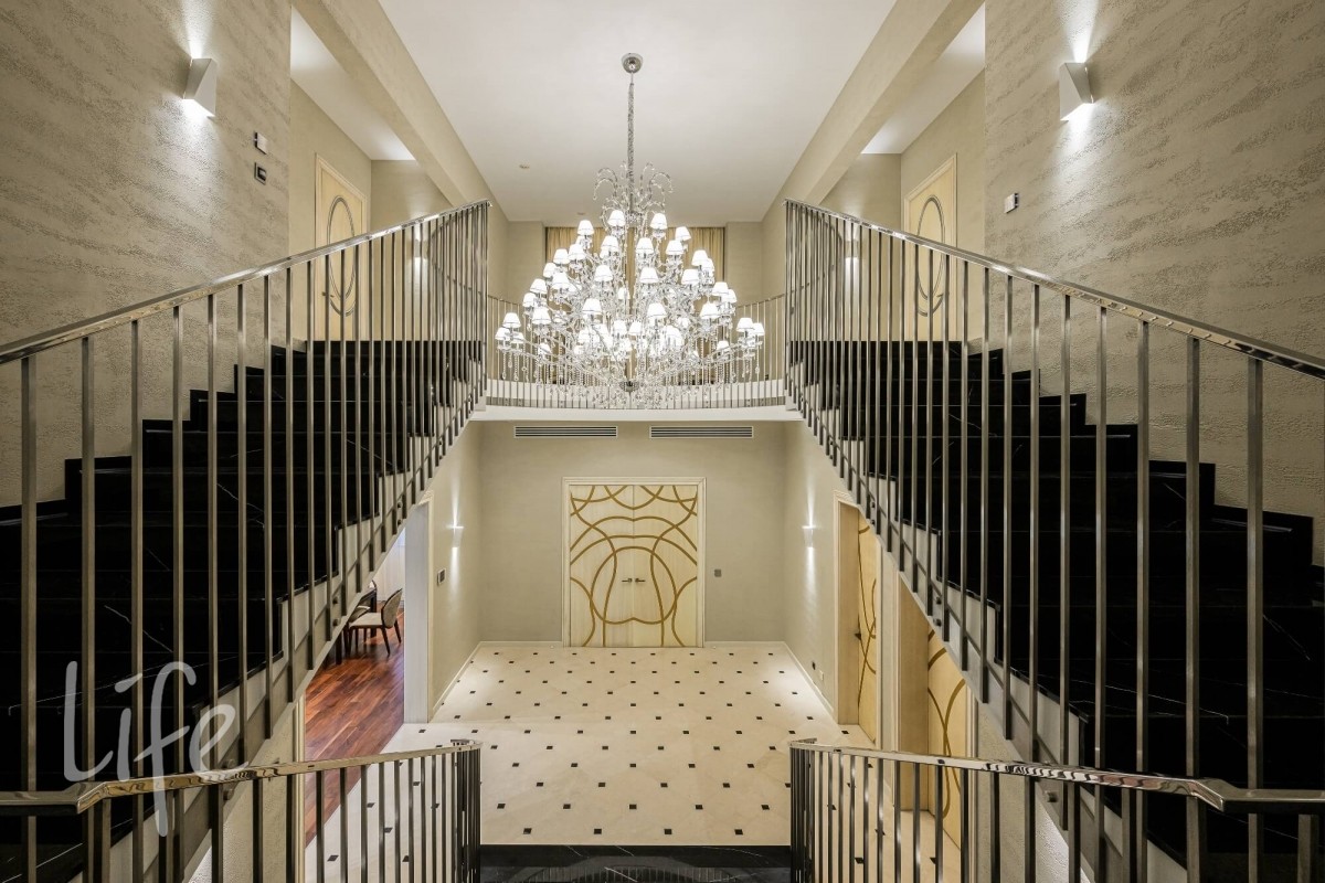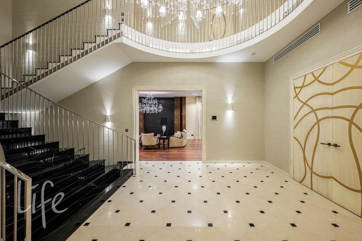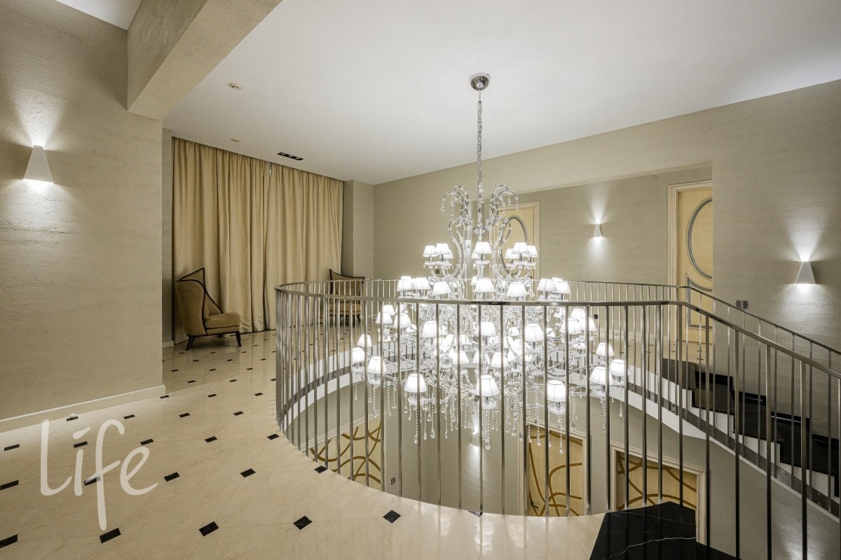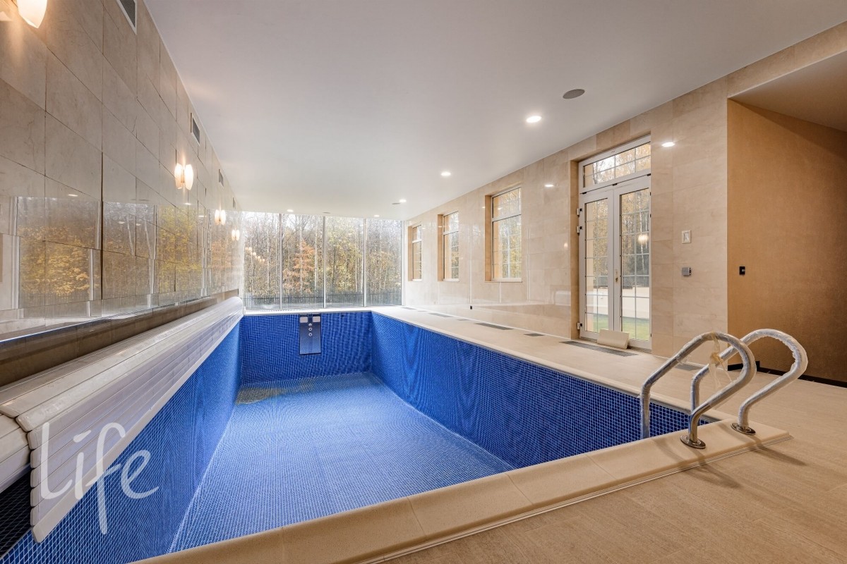 1 этаж: просторная светлая гостиная с отдельной каминной зоной, большая функциональная кухня с островом, оснащенная швейцарской техникой V-Zug, входной холл с великолепной парадной лестницей и акцентной люстрой с кристаллами Swarovski от итальянского ателье Beby Group, бассейн 10 м с противотоком на премиальном оборудовании Olуmpic с панорамным остеклением и живописным видом на лес, помещение для установки сауны или хаммама.