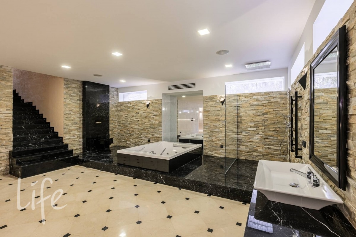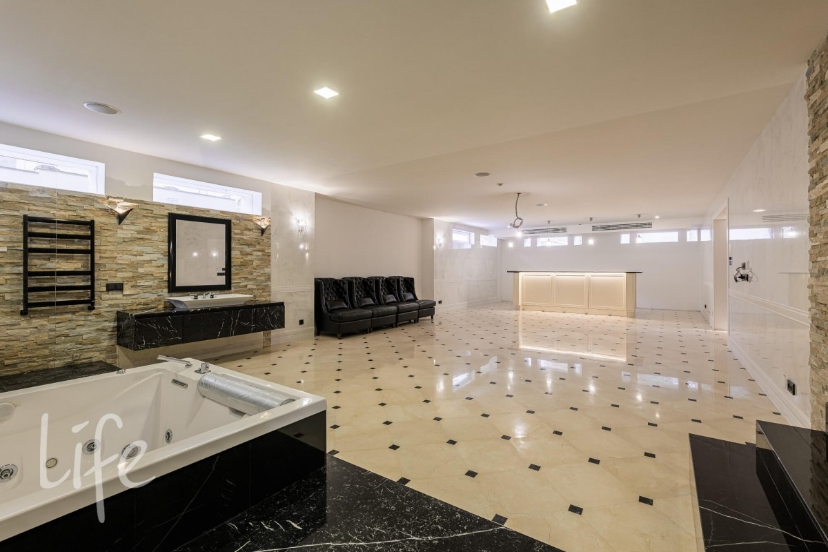 Цоколь: джакузи и комната отдыха площадью 87 кв.м с барной стойкой, выполнена подготовка для домашнего кинотеатра, тех.помещение бассейна, тренажерный зал, постирочная и кладовая.