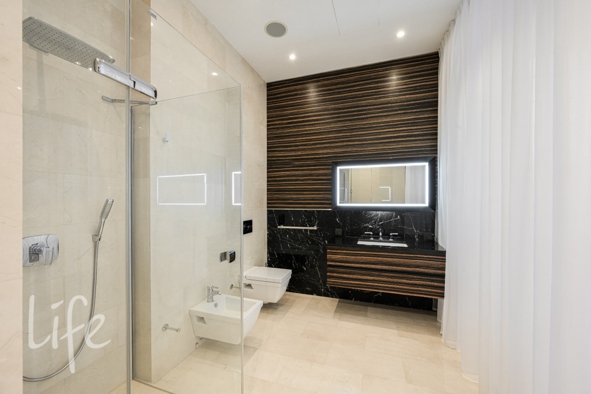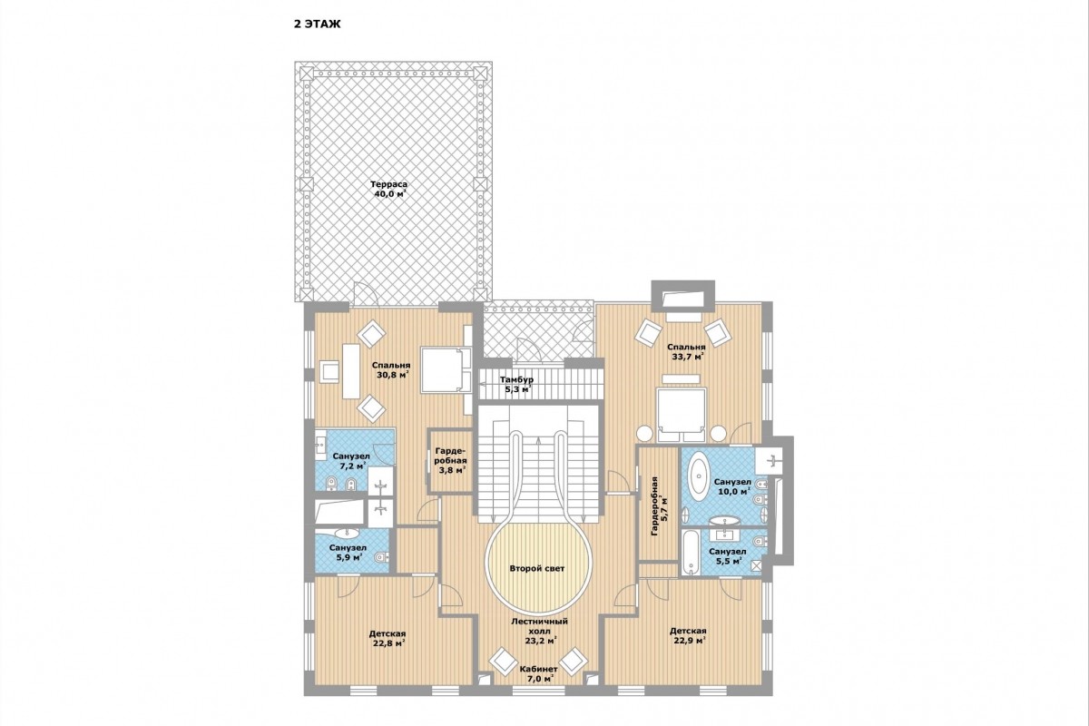 2 этаж: 4 просторные спальни с ванными комнатами и гардеробными, выходами на веранду с видом на лес, ванные комнаты оборудованы мебелью и сантехникой от итальянской фабрики Milldue и
