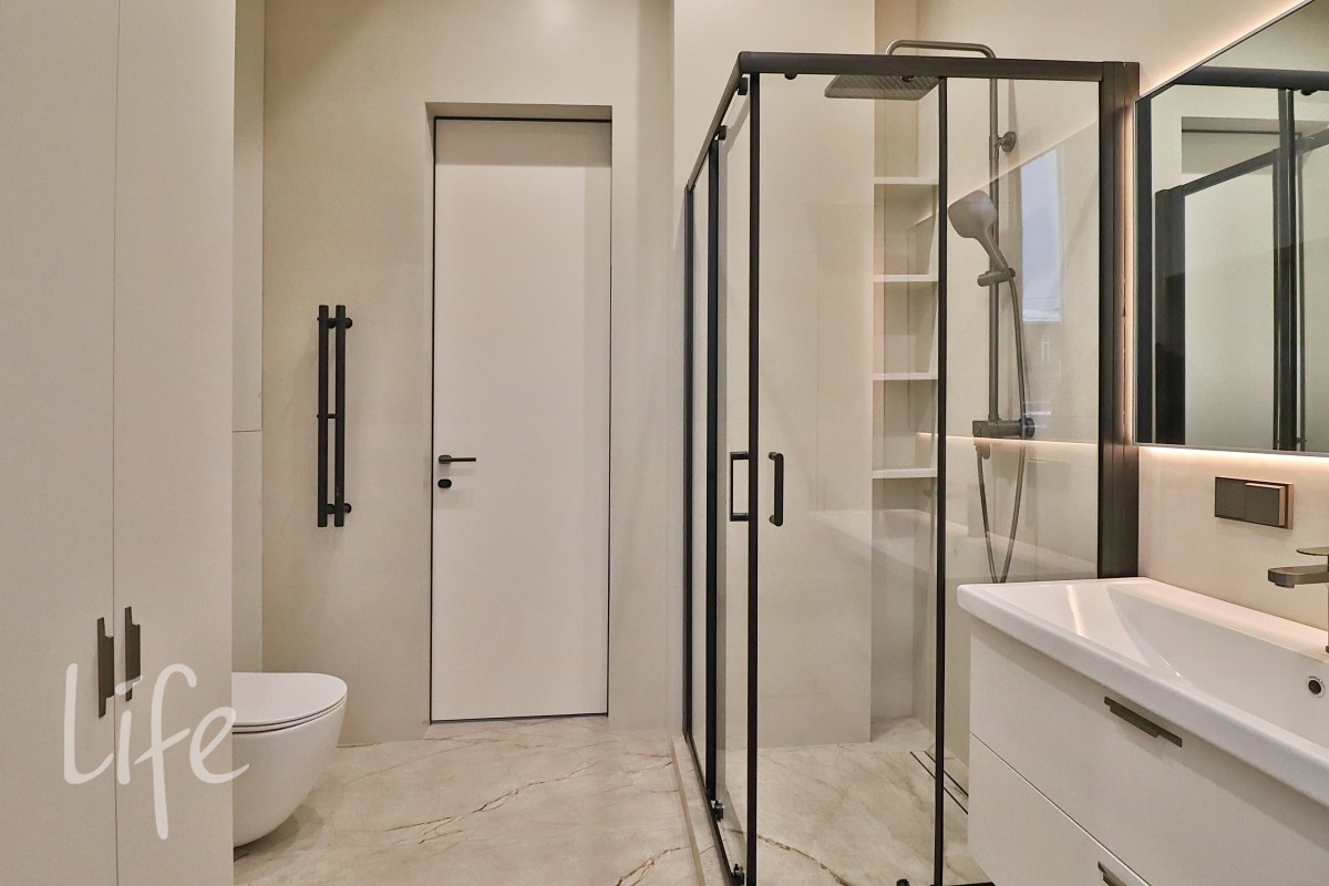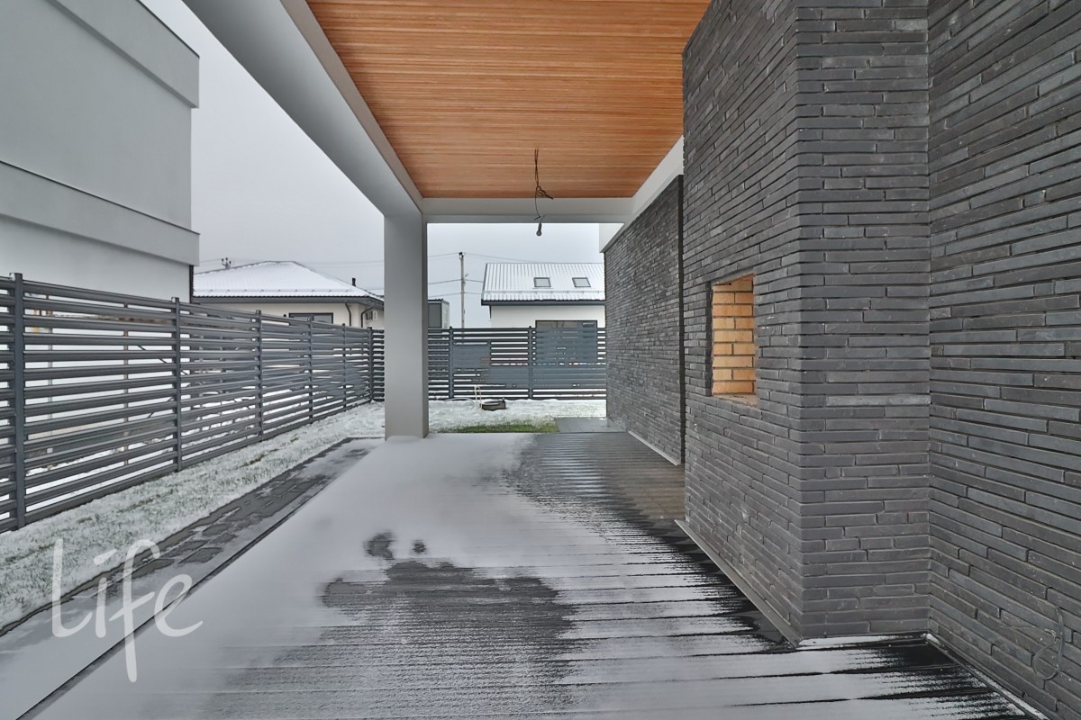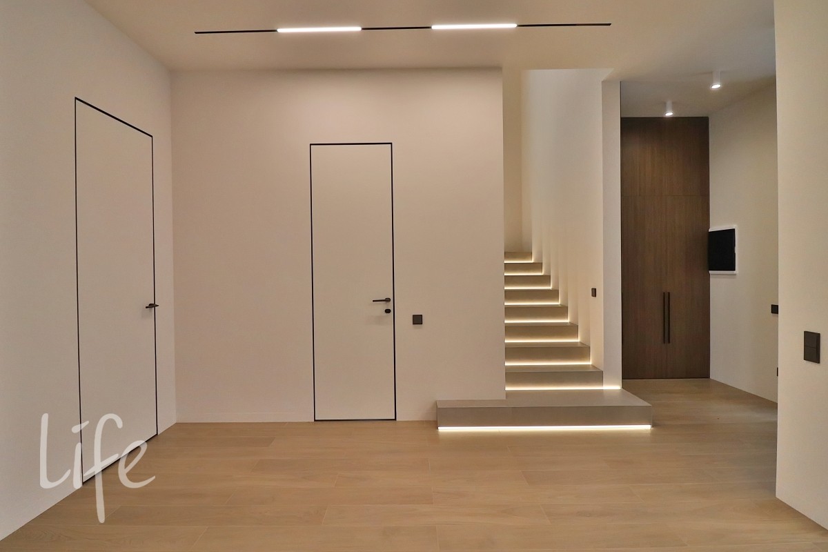 Интерьер выполнен в современном стиле, в светлых, мягких тонах. Дом всегда полон света, даже в пасмурные дни, благодаря большой площади остекления. Современная система освещения.