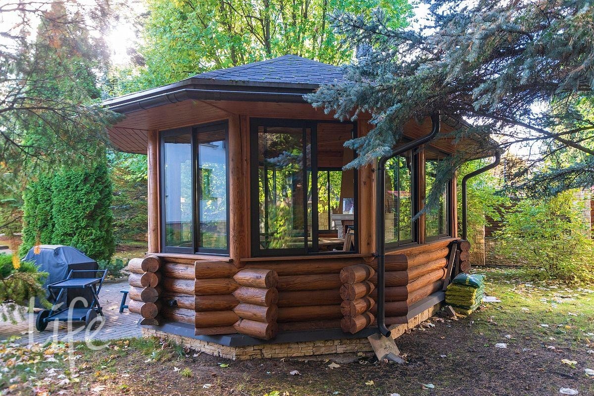 Участок с ландшафтным дизайном. На участке имеется красивая застекленная беседка с камином. Для инструментов предусмотрен хозблок.