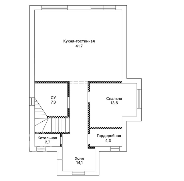 1 этаж: открытое пространство зона кухня, столовой, гостиной, выход на крытую террасу, камин, котельная, постирочная, спальня, су.